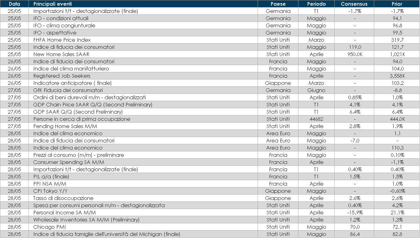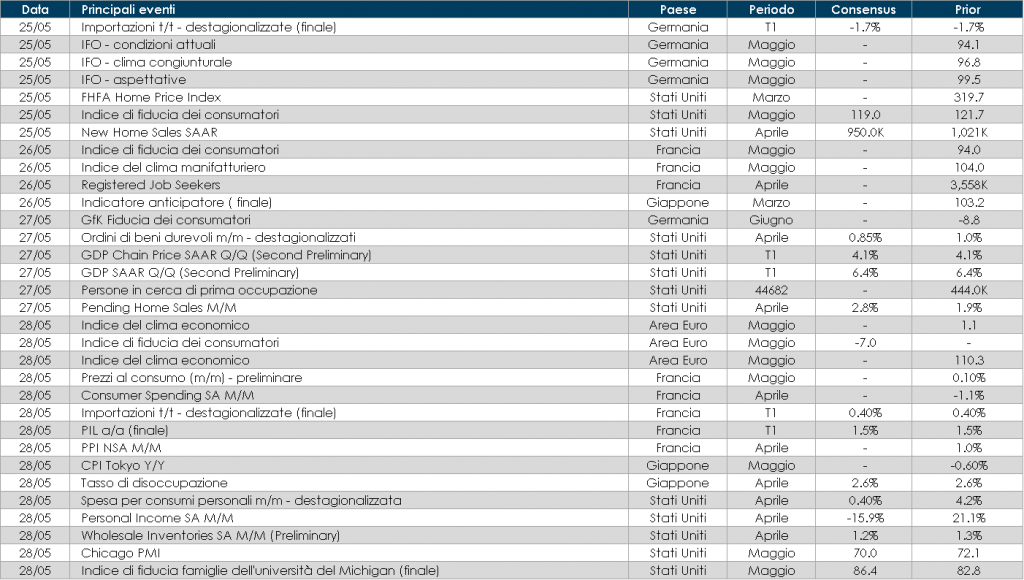 - Europa: I dati della settimana prossima faranno eco al messaggio odierno degli indici preliminari, con l’indice IFO e l’ESI della CE entrambi destinati a salire ulteriormente a maggio.