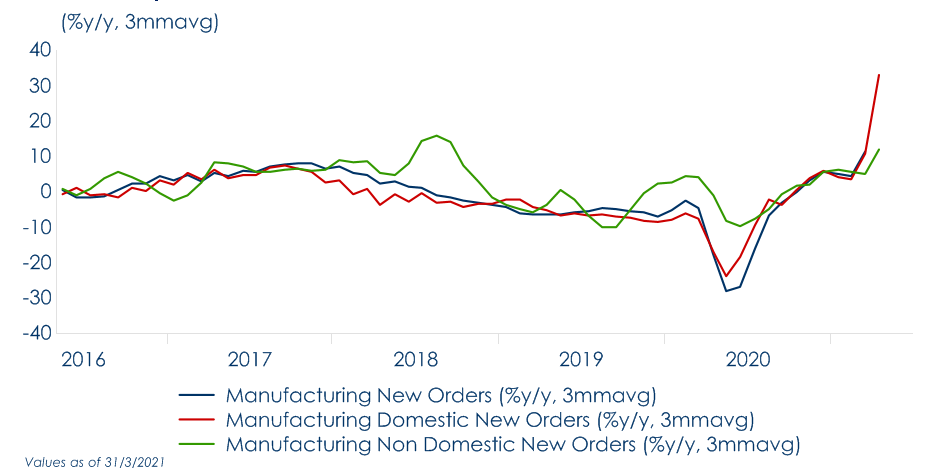 Fig.4: …mentre gli ordini del manifatturiero, sia domestici che esteri, sono in forte accelerazione. Entrambi i fattori precedono di solito un rimbalzo dell’attività produttiva.  |