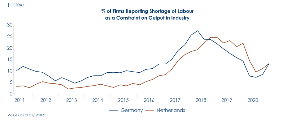 - Nel primo trimestre del 2021 la produzione economica tedesca è diminuita. Rispetto a T4 2020 l’inasprimento e il prolungamento delle misure di contenimento della pandemia hanno causato perdite maggiori al comparto dei servizi, mentre i consumatori hanno speso meno perché avevano già anticipato alcuni acquisti già nella seconda metà del 2020 in previsione della reintroduzione dell’IVA a inizio 2021.