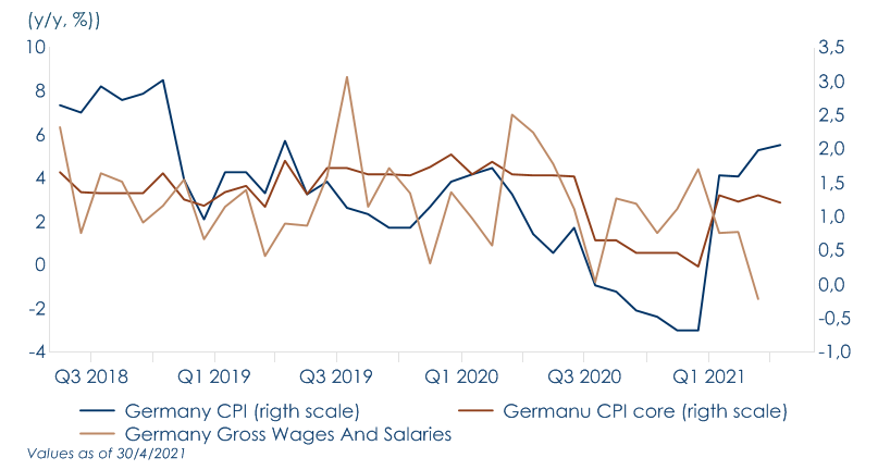 | Fig.7: … sebbene la pressione salariale resti bassa. La Germania ha tagliato l’IVA nella seconda metà del 2020 per stimolare la domanda. Gli effetti base di questo taglio porteranno quest’anno l’inflazione headline temporaneamente sopra il 3% a/a, ma l’inflazione core resta bassa.