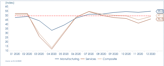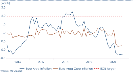 La BCE ha anche riconfermato la sua valutazione dello scenario economico ribadendo che le proiezioni economiche, su cui era stata calibrata la strategia di dicembre, debbano essere considerate ancora valide nonostante il miglioramento di alcuni dati economici (principalmente i dati sul settore manifatturiero – Fig.1) e alcune evoluzioni nello scenario economico, sia positive (avvio delle vaccinazioni, accordo Brexit, ripresa del comparto manifatturiero nell’Area, raggiungimento dell’accordo sul budget dell’Unione Europea) sia negative (aggravarsi della pandemia ed inasprimento delle misure di contenimento, rallentamento del comparto dei servizi e perseverante debolezza dell’inflazione). Sul fronte inflazione, il Presidente C. Lagarde ha riconfermato lo scenario di modesto recupero nei prossimi mesi, grazie sia al rialzo della componente energetica sia alla fine della temporanea riduzione dell’IVA in Germania, trascurando di sottolineare che si tratta di fattori transitori e non segnali di una forza inflattiva presente nell’Area Euro (Fig.2). I rischi per crescita ed inflazione restano rivolti verso il ribasso “ma in modo meno pronunciato”.