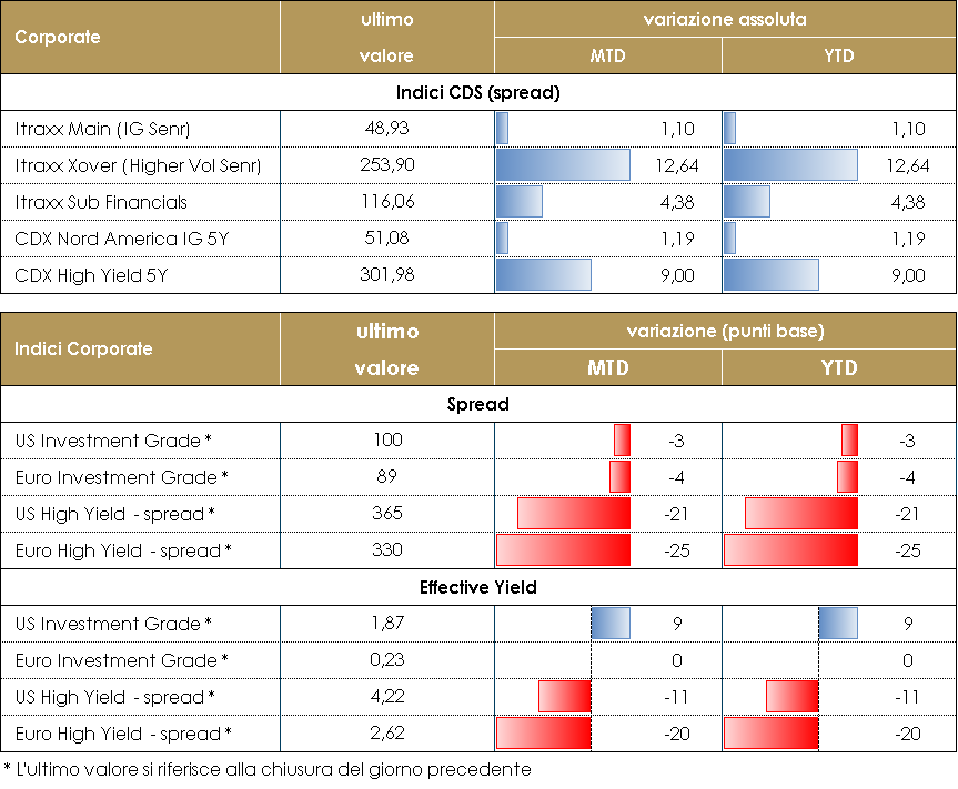 La settimana sul mercato del credito, così come per i principali asset rischiosi, è stata piuttosto negativa e comunque caratterizzata da una ripresa della volatilità e dall’allargamento degli spread a causa del nuovo aumento dei casi e delle nuove misure di lockdown annunciate. A pesare inoltre sul mercato degli emittenti periferici le difficoltà della maggioranza di governo in Italia con la debole fiducia ottenuta. Nella settimana il meeting della ECB non ha aiutato a supportare gli spread nonostante la conferma delle politiche monetarie espansive.Gli indici CDS hanno chiuso negativi nella settimana: Main (IG) +1bp, e Xover (HY) +5bps in Europa e sostanzialmente flat negli US dove nella settimana si è insediata l’amministrazione Biden. Negli indici cash lievemente peggiore la performance sul corporate dopo la migliore performance delle scorse settimane. Sul mercato primario la volatilità non ha frenato le emissioni che sono rimaste su livelli elevati come tipicamente accade in queste prime settimane dell’anno.Diverse sono state le operazioni su HY, con i nuovi deal di Verisure, Rekeep, il doppia tranche di Ineos Quattro, e i Tap delle recenti emissioni di WeBuild e United. Anche su Corporate Hybrid due emissioni per Total e CPI Properties, mentre sulle banche meno attivo il mercato con deal in prevalenza senior tra cui Goldman Sachs, Erste.Su corporate IG diverse emissioni tra cui due emittenti italiani, 2iReteGas e Acea, uscita con una doppia tranche oltre a Vonovia, Sagax e GBL.