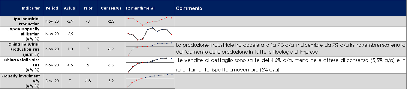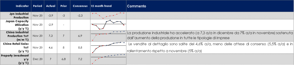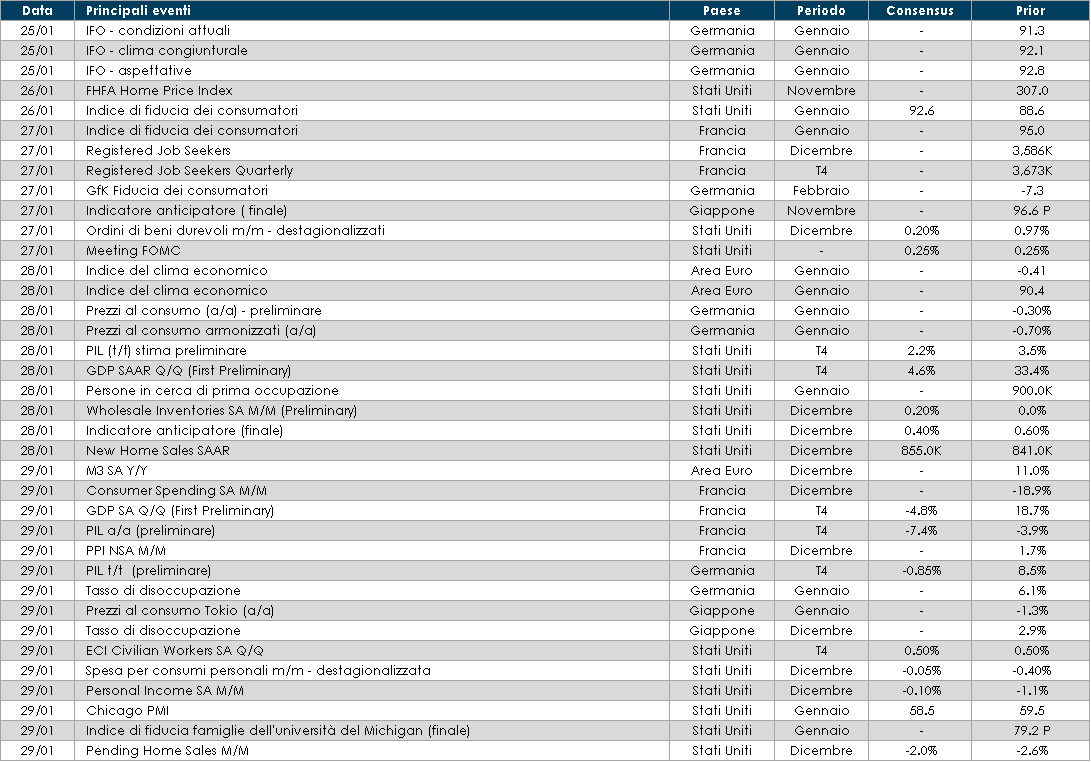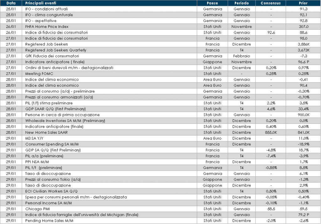 - Stati Uniti: mercoledì vi sarà il meeting di politica monetaria del FOMC. Sul fronte dati macroeconomici saranno pubblicati i dati sulle richieste di disoccupazione e sulla fiducia dei consumatori, nonché le domande di nuovi mutui. Sarà importante guardare ai dati sul reddito disponibile che permetteranno di valutare l’impulso fiscale di dicembre.