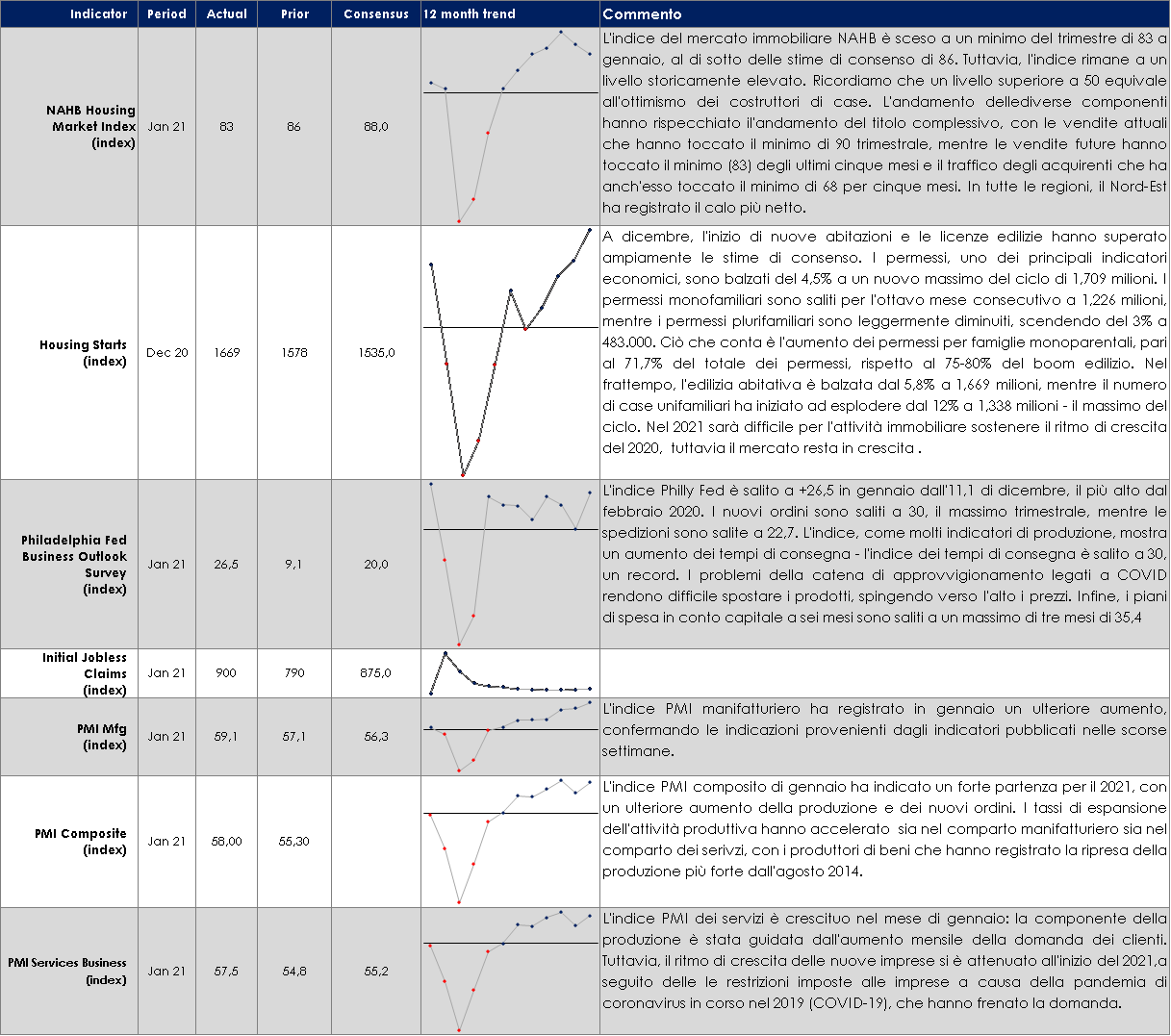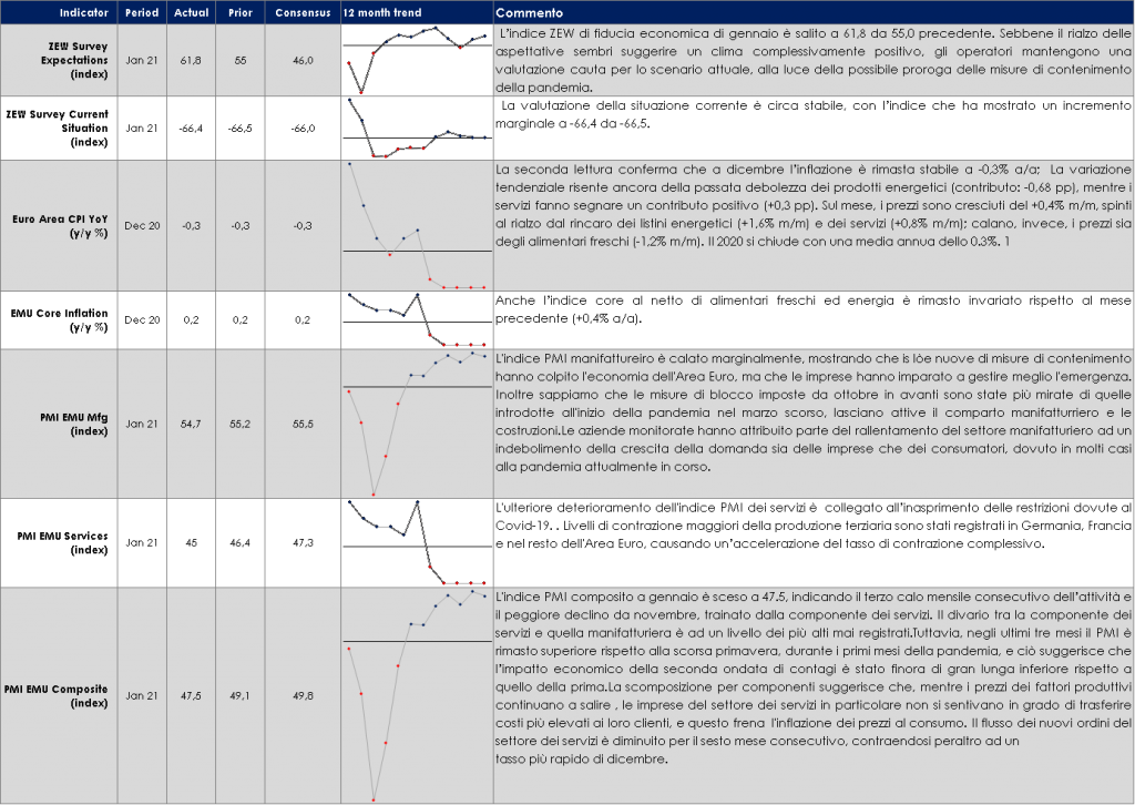 - Europa: inizia la pubblicazione della stringa di dati sul PIL dei diversi paesi in T4 2020. La Gemania pubblicherà l’indice di fiducia IFO. Inoltre, la settimana prossima sarà importante guardare le survey della CE, che dovrebbero essere capaci di arricchire di dettagli l’immagine consegnata oggi dagli indici PMI e il dato sulla crescita di M3, che potrà giocare da contraltare quantitativo dei segnali ricavati questa settimana dalla lending survey.