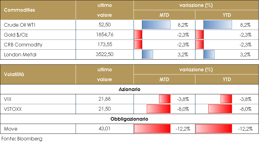 Giovedì Christine Lagarde ha raffreddato gli entusiasmi del mercato, segnalando il desiderio della banca centrale di essere “reattiva” piuttosto che “proattiva” durante il periodo che dovrebbe vedere l’economia europea uscire dalla crisi pandemica. Questo atteggiamento della BCE potrebbe spingere ulteriormente l’euro al rialzo, in particolare contro il dollaro. La FED, grazie al nuovo approccio (average inflation targeting), manterrà l’accomodamento monetario molto più a lungo che in passato, sostenendo un dollaro più debole. Il pacchetto fiscale appena annunciato negli USA (del valore di circa 1,9 trilioni di USD) contribuirà all’indebolimento della valuta.