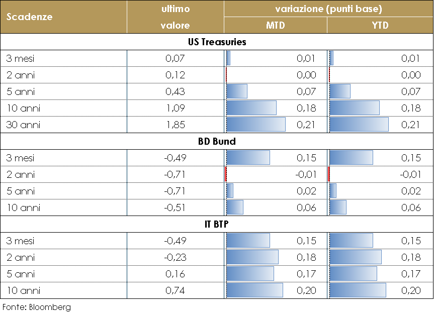La settimana, guidata dall’insediamento del Presidente Biden alla Casa Bianca, non ha conosciuto importati novità sul mercato dei titoli sovrani. Il rendimento dei titoli governativi dei principali paesi sviluppati sono rimasti pressochè stabili.