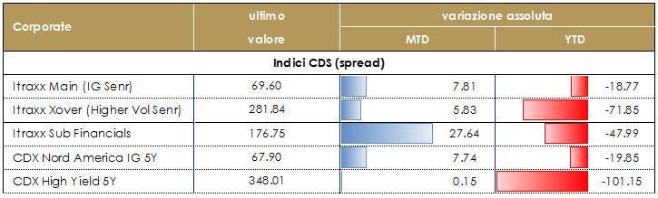 Nella settimana trascorsa il mercato corporate è stato caratterizzato da due fasi ben distinte: un inizio settimana molto positivo con un mercato primario oltremodo forte e una seconda parte decisamente in modalità riskoff, soprattutto nella seduta di venerdì dove nonostante i tassi risk free in forte discesa (con il bund tedesco sceso in territorio negativo) l’allargamento degli spread ha comunque determinato una performance negativa del comparto.Su base settimanale, inclusa la giornata odierna, gli indici HY hanno avuto performance di poco superiore allo 0% (sia in Eur che US HY) con performance negativa in particolare su subordinati finanziari dove prese di profitto sono iniziate già a metà settimana. Su Indici CDS, particolarmente liquidi ed utilizzati anche per hedging, l’allargamento nella settimana è stato più evidente ed inoltre condizionato anche dal roll del contratto dalla scadenza di dicembre a quella di giugno (5y Cds 06/24 vs 12/23). Itraxx Main (IG) ha chiuso a 65 (+5), mentre XOver (HY) a 289 (+19) e Sub Fin a 162 (+16); stessa dinamica, anche se meglio rispetto all’europa, in US, con IG (+3) e HY (+7) nella settimana della conferma della stance dovish della FED.Inizio settimana molto forte sul mercato primario, con nuovi record sia per le sizes giornaliere che per livelli raggiunti dai book delle nuove emissioni.Su emittenti finanziari in Euro segnaliamo una nuova emissione subordinata AT1 BBVA (1Bio Perp nc5, 6%) e due T2 Credit Agricole (1.250Bio MS+150), Danske (750Mio, 10nc5 MS+250bp); su bond senior, Non Preferred SocGen (1.250Mio MS+120bp), Nykredit (600Mio 5y MS+92bp) mentre su Preferred Bankia (500Mio MS+85bp record book 4.9Bio, 9.5x) e CaixaBank (1Bio, MS+90bp). Infine per i finanziari covered Lloyds (5y 1.5Bio MS+18bp) Credit Agricole Italia (750Mio Frn Eur+25bp), Credit Agricole (750Mio 10y MS+13bp).Sui corporate non finanziari, emissioni multitranche per Abertis (5y 600Mio, 8y 1Bio, 12y 1Bio) e Schaeffler (750Mio 3y 1.125%, 800Mio 5y 1.875%, 650Mio 8y 2.875%) mentre singola emissione per Telstra (600Mio Senr MS+80bp) e CDP (750Mio ms+195)