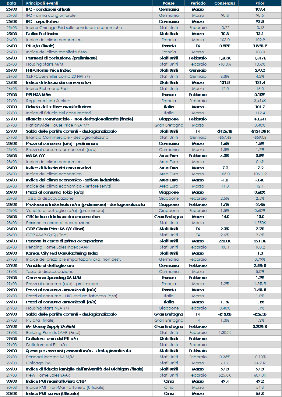- Stati Uniti: la settimana ha diversi dati rilevanti in uscita, ad iniziare dalla terza lettura del PIL e dalla misurazione della fiducia dei consumatori da parte dal Conference Board. Tra gli altri dati di rilievo: redditi e spese personali, bilancia commerciale, vendite di case nuove e nuove costruzioni abitative.