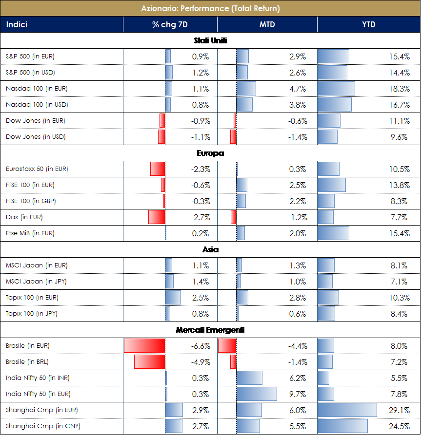 Mercati azionari in leggero rialzo nel corso della settimana, che si conclude comunque all’insegna della volatilità a causa di dati peggiori delle attese nell’Area Euro. A fronte di banche centrali accomodanti (soprattutto FED e BCE) permane l’incertezza sulla tenuta del ciclo macroeconomico e degli utili aziendali. Sullo sfondo anche l’incertezza del tema Brexit (a pochi giorni dalla sua “naturale” scadenza a due anni di distanza dal referendum) e dello scontro commerciale USA-Cina.