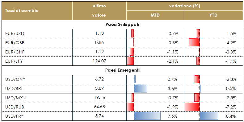 In un orizzonte di medio periodo, sull’ euro continuano a pesare le incognite politiche (Brexit, elezioni), le debolezza della congiuntura economica e l’atteggiamento molto prudente da parte della BCE. Per questo da inizio anno l’euro si è indebolito di circa il 2% contro le principali valute dei partners commerciali (Euro Trade weighted) e del 6% circa rispetto ad un anno fa. Il tasso di cambio dell’euro rispetto al dollaro è vicino ai minimi del novembre dello scorso anno (e -10% circa a/a). Dal dicembre scorso torna invece a rafforzarsi la valuta cinese, variabile chiave nella comprensione ed evoluzione della guerra commerciale in corso. A pochi giorni, nelle intenzioni iniziali, dal Brexit e in attesa di nuove notizie, la sterlina si stabilizza, mentre in chiusura di settimana si rafforza lo yen (valuta risk-off hedge) in concomitanza con la correzione al ribasso di venerdì delle borse mondiali. |