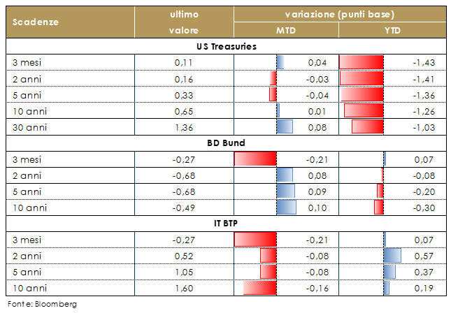 MERCATI DEI TITOLI GOVERNATIVI Settimana caratterizzata dal clima di cautela causato dalle tensioni che tornano a registrarsi tra Cina e Stati Uniti.In US, dai verbali della Fed relativi all’ultima riunione emerge come tra i membri sono iniziate le discussioni su come rendere più esplicita la forward guidance sui tassi di interesse così come la possibilità di fissare un tetto sui tassi a breve e medio termine. Ben accolta dal mercato l’asta da 20 miliardi sul nuovo titolo a 20 anni (il primo dal 1986): l’emissione si è conclusa con un bid-to-cover del 2,53. In Area euro, Francia e Germania hanno annunciato che sosterranno l’iniziativa di costituire un fondo temporaneo per la ripresa, finanziato da emissioni di debito dell’Unione Europea, con l’obiettivo di intervenire mediante trasferimenti alle regioni e ai settori più colpiti dalla pandemia. A frenare gli entusiasmi, sono giunte le dichiarazioni contrarie da alcuni paesi del nord che presenteranno a breve una loro controproposta.La settimana è stata dominata dal lancio del nuovo BTP Italia 5y: ottimo il responso sia dagli investitori retail che dagli istituzionali che hanno permesso al Tesoro di raggiungere una size di emissione totale di 22.3 miliardi: si tratta di un record dato che l’emissione btp Italia del 2013 (la più grande fino ad ora) aveva raggiunto i 22.2bn. Buona anche la reazione del mercato (si temeva qualche vendita in più su futures) e invece dopo la pubblicazione della size totale i BTPs hanno recuperato chiudendo con i tassi addirittura in calo e con lo spread BTP/Bund sceso in area 210 bps.Da notare, infine, che per la prima volta anche il tesoro inglese ha collocato un bond con rendimento negativo, segno che il mercato si attende ulteriori stimoli anche dalla BoE che non ha escluso la possibilità di avere tassi di rifinanziamento sotto lo zero nel prossimo futuro. A cura del team obbligazionario di Mediobanca SGR