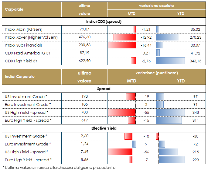 Il mercato corporate ha chiuso la settimana con tono molto positivo grazie soprattutto al riskon che ha caratterizzato le prime sedute della settimana.Il tono sul mercato secondario é stato molto positivo con flussi che hanno visto privilegiare le parti di mercato a maggior beta, finanziari subordinati e high yield. Il mercato primario ha continuato con estrema forza nel corso della settimana con deal che hanno ricevuto un ottimo interesse dai real money. Spread su indici cds in decisa contrazione l in Europa con IG (Itraxx Main) che ha chiuso la settimana a -10, mentre performance ancora migliore su HY (Itraxx Xover) -65bp in una settimana. Anche in US dinamica degli spread sostanzialmente identica con restringimento di 9bp su IG e contrazione di 60bp su HY.Sul mercato primario buona attività con diverse emissioni sia su financial che su Corporate, IG e HY.Su corporate Auto segnaliamo in particolare l’emissione di Ferrari( NR 650Mio 5y 1.50%). A cura del team obbligazionario di Mediobanca SGR