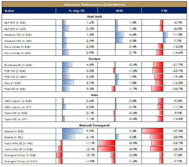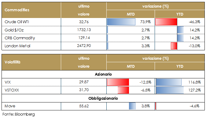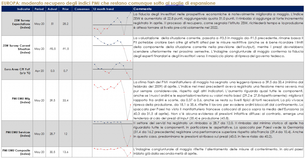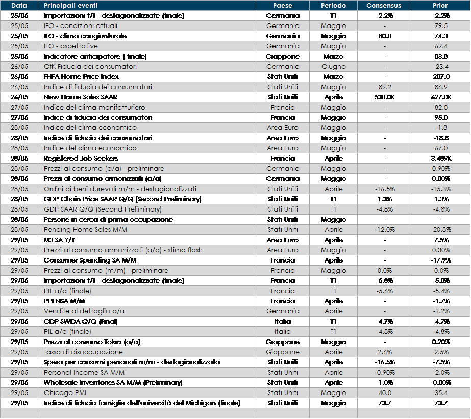 MERCATI AZIONARI In Europa ha dominato la notizia dell’accordo franco-tedesco. Fuori dai confini europei la settimana si conclude nuovamente tra le perplessità del mercato con l’acuirsi delle tensioni Cina-USA. Cresce anche la preoccupazione tra Cina e Hong Kong con l’annuncio di una legge sulla sicurezza nazionale. Sul fronte cinese, la National People’s Congress (NPC) non ha dato alcuna visibilità sui target di crescita futura del GDP complici l’alta incertezza sulla ripresa economica; il deficit di bilancio è stato invece aumentato al 3,6% (3% durante la crisi del 2008, 2,8% nel 2019). A livello monetario l’impegno è di portare la money supply “significantly” sopra il livello del 2019. Stessa filosofia anche lato USA, le dichiarazioni di Powell durante la settimana hanno lasciato ben intendere che la FED continuerà a supportare l’economia: “committed to using its full range of tools” e che i tassi negativi sono attualmente inappropriati per gli Stati Uniti. Il messaggio è stato chiaro, non ci si aspetta una V-shape recovery ma piuttosto una U-shape e, a livello di outlook, è stato previsto un potenziale danno di lungo periodo legato a rischi di stress finanziario, cambiamenti nel comportamento dei consumatori, domanda debole e riduzione sui business investments. Parafrasando Albert Edwards, un uomo non può vivere di sola acqua e la sua resistenza massima senza cibo è di circa 60 giorni; così come l’essere umano anche i mercati azionari non possono essere sorretti dalla sola liquidità immessa nel sistema ma necessitano di fondamentali positivi. La fame si fa sentire. In termini di indici di mercato, l’Europa questa settimana ha rimosso il divieto di vendite allo scoperto (short ban presente da marzo), facilitato da una normalizzazione della volatilità seppur in leggero aumento in questi ultimi giorni, e l’SXXE ha registrato una performance positiva pari a +4,50%. I maggiori contributori di performance sono stati i settori Auto +8%, Banche +6,50% e Industriali +6,40%; Telecom 0%, Media e Real Estate +1,50% i contributori minori. In termini di singoli titoli troviamo tra i best performer settimanali Ryanair +28%, Amadeus +25% e Thyssenkrupp +24% contro i worst Suez -11%, TIT -11% e Klepierre -9%. EuroStoxx50 trainato da Amadeus, Daimler, Fresenius SE e frenato da Eni, Unilever e Telefonica. A livello nazionale, FTSE MIB chiude a +1% con Enel +10%, Unicredit +9,50% e Buzzi Unicem +9% tra i best mentre TIT, Recordati -7% e Italgas -6% tra i peggiori. Mercato delle MidCap debole (+0,60%) con Digital Bros +27%, Carel Industries +13% e Piaggio +12% tra i migliori della settimana e Mediaset -14%, Cattolica Assicurazioni -14% e Unipolsai -11% tra i peggiori. Il mercato americano S&P500 a +2,70% è trainato da Mcycl Manf +22%, Airlines +20,50% e Reinsurance +20%; Gold, Pharma e Wireless (-3%) i settori peggiori. In termini di single names L Brands +35%, Norwegian Cruise Line +35% e United Airlines +30% sono risultati essere i best della settimana; Campbell Soup -11%, Citrix -7% e Dexcom -6,50% i worst. Dow Jones a +3% con Boeing e Raytheon Tech tra i migliori e Nasdaq a +2,50%. Prezzo del petrolio sistematicamente in ripresa da ormai sei sedute, registra il rally più lungo in 15 mesi (con il calo settimanale più significativo delle scorte USA dal dicembre scorso). A cura del team Core Equity Value di Mediobanca SGR