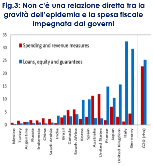 Fig 2: in T1 la decrescita della Germania è stata minore di quella degli altri paesi europei Fig.3: Non c’è una relazione diretta tra la gravità dell’epidemia e la spesa fiscale impegnata dai governi