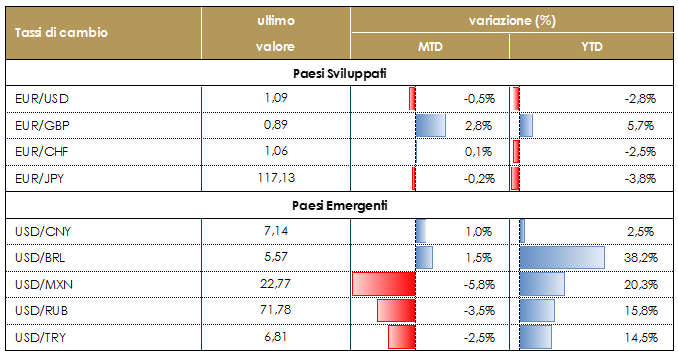 Il prezzo del petrolio risulta in rialzo la quarta settimana consecutiva e consolida sopra i 30 dollari. Restano le preoccupazione relativamente alla debolezza della crescita globale. A pesare è il fatto che il Governo cinese non ha rilasciato il consueto target di crescita del 2020, a conclusione del Congresso Nazionale del Popolo cinese. In un contesto fortemente condizionato dalle rinnovate preoccupazioni circa i rapporti commerciali tra USA e Cina, possano mettere un altro importante freno alla ripresa economica. Volatilità ha smesso di rallentare e il VIX resta lontano dalla sua media di lungo periodo. Dati aggiornati alle ore 17.30 del 22 maggio 2020 TASSI DI CAMBIO La settimana è iniziata con l’annuncio dell’accordo tra Francia e Germania per un Recovery Fund di 500 miliardi di euro. Sebbene l’attuazione resti piuttosto incerta e le dimensioni ridotte, si tratta di un importante passo simbolico per il futuro sulla solidarietà dell’UE. Lo slittamento a mercoledì prossimo della proposta della Commissione Europea sul Recovery Fund ha smorzato l’ottimismo che si era creato a inizio settimana, così la settimana si chiude con una modesta debolezza dell’euro, con EUR/USD che torna in area 1,09 e EU/JPY a 117,20. Sterlina sulla difensiva ancora in movimento tra 1,21 e 1,22 GBP/USD contro dollaro e in area 0,89 EUR/GBP contro euro. I PMI di maggio sono migliorati più delle attese ma lo scenario rimane molto compromesso, soprattutto per via dell’incertezza sui negoziati con l’UE. In assenza di spunti nuovi lo yen si è stabilizzato rispetto al dollaro. Dati aggiornati alle ore 17.30 del 22 maggio 2020 VIEW STRATEGICA Con l’incupirsi delle prospettive per l’economia globale, il dollaro USA si avvantaggerà del suo ruolo di valuta rifugio. |
