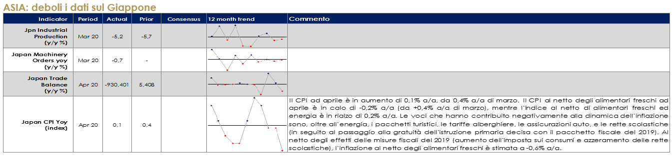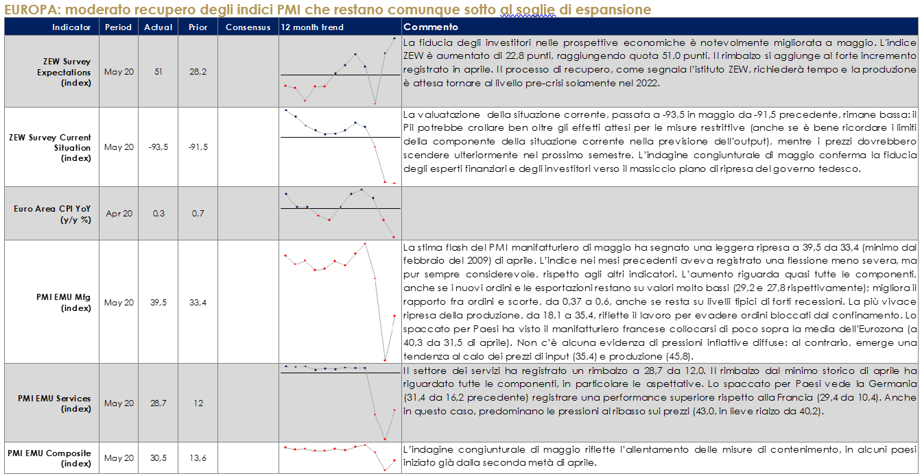 MERCATI AZIONARI In Europa ha dominato la notizia dell’accordo franco-tedesco. Fuori dai confini europei la settimana si conclude nuovamente tra le perplessità del mercato con l’acuirsi delle tensioni Cina-USA. Cresce anche la preoccupazione tra Cina e Hong Kong con l’annuncio di una legge sulla sicurezza nazionale. Sul fronte cinese, la National People’s Congress (NPC) non ha dato alcuna visibilità sui target di crescita futura del GDP complici l’alta incertezza sulla ripresa economica; il deficit di bilancio è stato invece aumentato al 3,6% (3% durante la crisi del 2008, 2,8% nel 2019). A livello monetario l’impegno è di portare la money supply “significantly” sopra il livello del 2019. Stessa filosofia anche lato USA, le dichiarazioni di Powell durante la settimana hanno lasciato ben intendere che la FED continuerà a supportare l’economia: “committed to using its full range of tools” e che i tassi negativi sono attualmente inappropriati per gli Stati Uniti. Il messaggio è stato chiaro, non ci si aspetta una V-shape recovery ma piuttosto una U-shape e, a livello di outlook, è stato previsto un potenziale danno di lungo periodo legato a rischi di stress finanziario, cambiamenti nel comportamento dei consumatori, domanda debole e riduzione sui business investments. Parafrasando Albert Edwards, un uomo non può vivere di sola acqua e la sua resistenza massima senza cibo è di circa 60 giorni; così come l’essere umano anche i mercati azionari non possono essere sorretti dalla sola liquidità immessa nel sistema ma necessitano di fondamentali positivi. La fame si fa sentire. In termini di indici di mercato, l’Europa questa settimana ha rimosso il divieto di vendite allo scoperto (short ban presente da marzo), facilitato da una normalizzazione della volatilità seppur in leggero aumento in questi ultimi giorni, e l’SXXE ha registrato una performance positiva pari a +4,50%. I maggiori contributori di performance sono stati i settori Auto +8%, Banche +6,50% e Industriali +6,40%; Telecom 0%, Media e Real Estate +1,50% i contributori minori. In termini di singoli titoli troviamo tra i best performer settimanali Ryanair +28%, Amadeus +25% e Thyssenkrupp +24% contro i worst Suez -11%, TIT -11% e Klepierre -9%. EuroStoxx50 trainato da Amadeus, Daimler, Fresenius SE e frenato da Eni, Unilever e Telefonica. A livello nazionale, FTSE MIB chiude a +1% con Enel +10%, Unicredit +9,50% e Buzzi Unicem +9% tra i best mentre TIT, Recordati -7% e Italgas -6% tra i peggiori. Mercato delle MidCap debole (+0,60%) con Digital Bros +27%, Carel Industries +13% e Piaggio +12% tra i migliori della settimana e Mediaset -14%, Cattolica Assicurazioni -14% e Unipolsai -11% tra i peggiori. Il mercato americano S&P500 a +2,70% è trainato da Mcycl Manf +22%, Airlines +20,50% e Reinsurance +20%; Gold, Pharma e Wireless (-3%) i settori peggiori. In termini di single names L Brands +35%, Norwegian Cruise Line +35% e United Airlines +30% sono risultati essere i best della settimana; Campbell Soup -11%, Citrix -7% e Dexcom -6,50% i worst. Dow Jones a +3% con Boeing e Raytheon Tech tra i migliori e Nasdaq a +2,50%. Prezzo del petrolio sistematicamente in ripresa da ormai sei sedute, registra il rally più lungo in 15 mesi (con il calo settimanale più significativo delle scorte USA dal dicembre scorso). A cura del team Core Equity Value di Mediobanca SGR