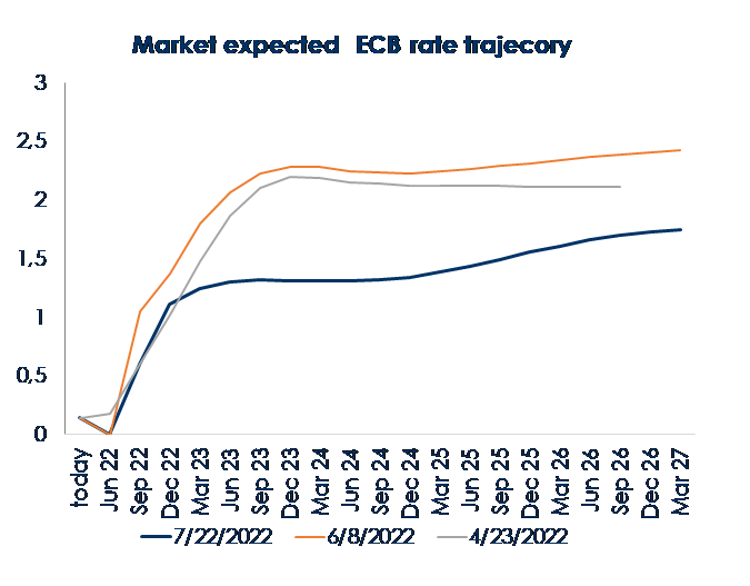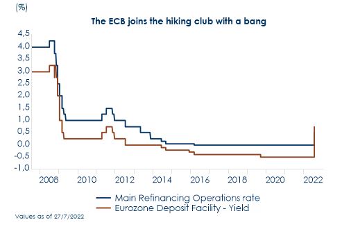 Durante la riunione di luglio, la BCE ha alzato i tassi di interesse di riferimento di 50 pb, accelerando rispetto a quanto annunciato a giugno, ed ha concluso al suo interno un accordo all’unanimità per il Transmission Protection Instrument (TPI), il nuovo strumento anti-frammentazione che dovrà garantire la trasmissione della politica monetaria in tutti i paesi dell’Area Euro.
