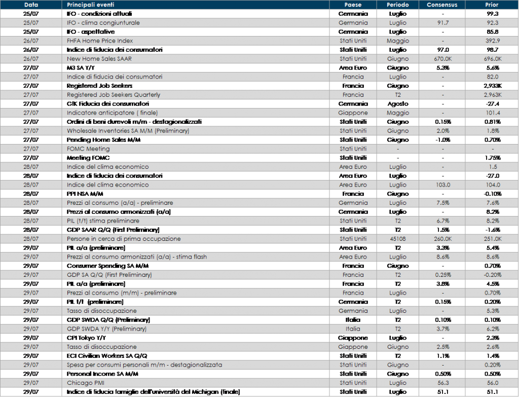 - Stati Uniti: l’attenzione sarà rivolta alla riunione di politica monetaria delle Federal Reserve. Sul fronte macroeconomico la settimana vedrà anche negli Stati Uniti la pubblicazione del dato preliminare sul PIL per il secondo trimestre e quello sulla fiducia dei consumatori elaborato dall’Università del Michigan. Inoltre, verrà reso noto il dato sugli ordinativi di beni durevoli, le scorte all’ingrosso, l’indice PMI di Chicago, l’indice manifatturiero della FED di Richmond e per concludere l’indice della produzione manifatturiera della Fed di Dallas.