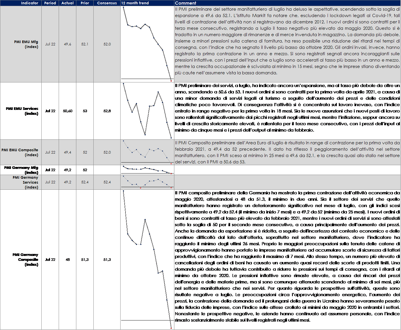 EUROPA: I PMI dell’Area Euro si sono fortemente deteriorati a luglio, con l’indice composito ora in territorio di contrazione
