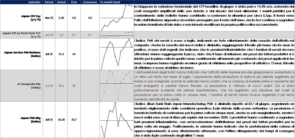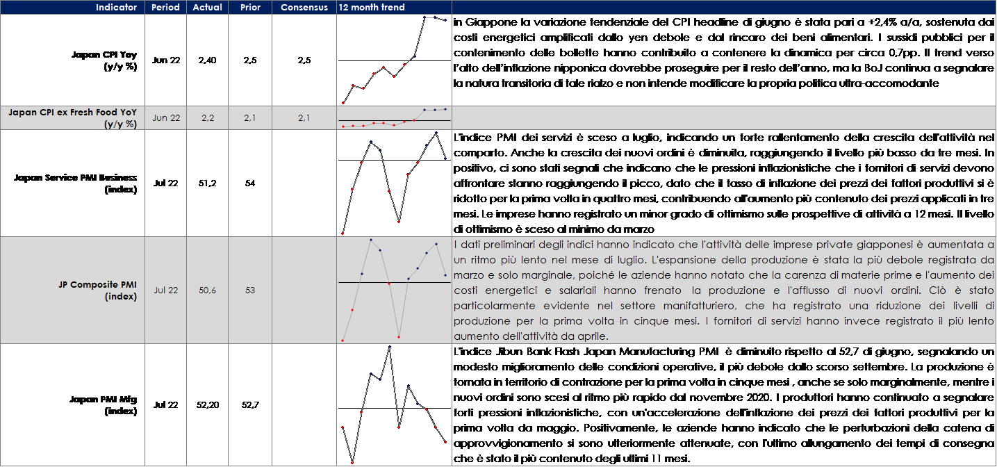 Durante la settimana due eventi nell’Area Euro hanno guidato l’attenzione dei mercati: il meeting di luglio della BCE e la crisi di Governo in Italia. La BCE ha sorpreso i mercati iniziando il suo ciclo di rialzo con un aumento di 50pb, abbandonando completamente la forward guidance. Ciò ha innescato un ulteriore e significativo sell-off nel segmento a breve della struttura a termine, appiattendola. Viceversa, l’annuncio da parte della BCE del TPI, non è bastato a contenere il differenziale BTP-Bund, che è tornato ai livelli di giugno proprio perché gli spread BTP-Bund hanno iniziato a prezzar un maggior premio per il rischio politico. Questo è esattamente il tipo di scenario in cui la BCE avrà difficoltà ad agire, anche con il nuovo strumento a disposizione. In prospettiva, dovrebbe proseguire il flattening della struttura a termine governativa tedesca, poiché le sorprese al rialzo dell’inflazione sostengono un ciclo di rialzi dei tassi anticipato e il terminal rate, indicato ieri dal Presidente Lgarde, fornisce un’ancora ai tassi intermedi. Inoltre, i tassi a lungo termine potrebbero essere penalizzati da un sentiment negativo e da aspettative di crescita a lungo termine più deboli, come indicano anche i dati dei PMI di luglio. In Giappone la lBoJ ha lasciato immutata la sua politica monetaria: -0,1% per i tassi a breve termine e limite dello 0-0,25% per i rendimenti obbligazionari a 10 anni. La BoJ prevede che l’inflazione supererà il suo target del 2% quest’anno ma questo non impedirà di proseguire il suo approccio ultra-accomodante. Se l’aumento dei costi dei carburanti e delle materie prime è il principale elementi che spinge l’inflazione al di sopra del 2%, la BoJ ha ribadito che non ha nessuna fretta di ritirare lo stimolo monetario poiché il rallentamento della crescita globale continua a gravare sulle prospettive di recupero per l’economia. La BoJ ha ridotto la previsione di crescita per questo anno al 2,4% dal 2,9%, a causa dei persistenti vincoli di fornitura e all’aumento dei prezzi delle materie prime. Negli Stati Uniti, la struttura a termine governativa questa settimana ha registrato un calo su tutte le scadenze ad eccezione di quelle sotto l’anno, calo che è stato guidato da una moderazione delle breakeven inflation a fronte di un aumento del term premium sulle scadenze intermedie. La settimana prossima l’attenzione sarà rivolta alla riunione di luglio della Federal Reserve. I mercati prevedono una piccola probabilità di un rialzo di 100 punti base da parte della Fed e di circa 200 punti base di rialzi cumulativi fino a dicembre. Data la crescente attenzione ai rischi di recessione, i mercati saranno molto interessati a capire la posizione della Fed sul trade-off tra crescita e inflazione e quali sarebbero i potenziali fattori scatenanti di una pausa della Fed. VIEW STRATEGICA Governativo US: I trend di lungo termine proseguono su traiettorie al rialzo sostenibili, il ciclo economico (pur in rallentamento) è ancora favorevole e le condizioni finanziarie rimangono accomodanti. Nell’attuale contesto geopolitico l’area statunitense appare favorita alla luce di 3 fattori: l’indipendenza energetica la rende meno fragile ai rialzi dell’oil, il livello dell’interscambio commerciale con la Russia è modesto ed infine la composizione dell’indice azionario la rende più resiliente agli attuali rischi. Governativo EU: Continuiamo ad avere una view negativa sui rendimenti obbligazionari europei, aspettandoci una perdita di valore sia dalla componente carry che dalla componente prezzo. |