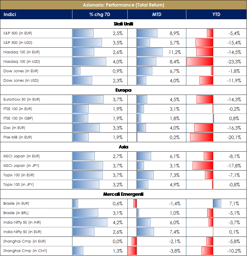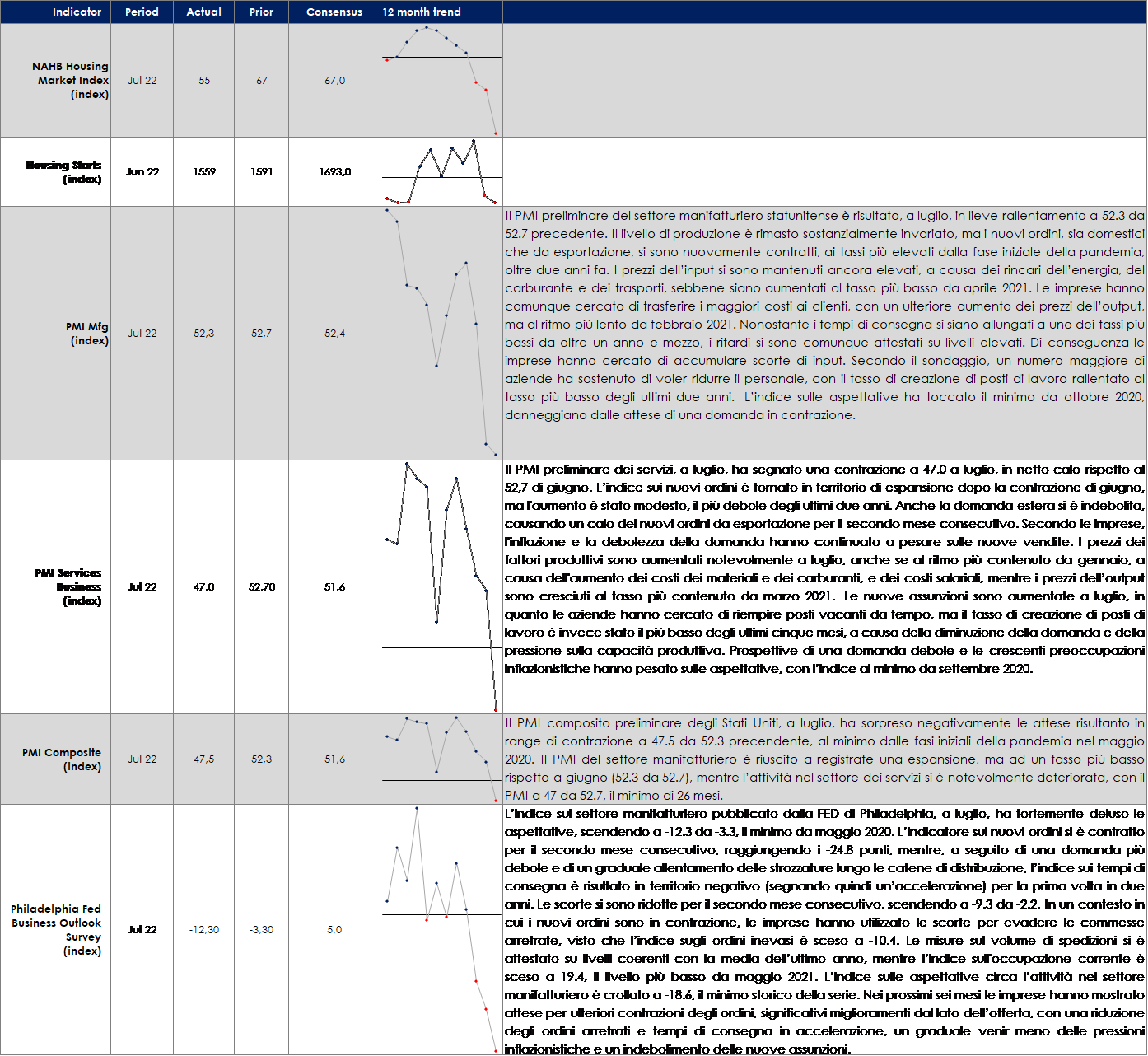 Il prezzo del petrolio torna sotto i 100 dollari al barile dopo una settimana volatile in vista del prossimo incontro OPEC+ del 3 agosto. L’aumento dell’offerta dai produttori arabi, come da promesse fatte al presidente americano, Biden, appare ora un’ipotesi molto meno percorribile. L’Arabia Saudita ha, infatti, rivisto al ribasso la sua stima di massima offerta erogabile e si dice prossima al tetto della sua produzione giornaliera, incapace quindi di spingersi oltre. Le scorte settimanali di petrolio EIA negli Stati Uniti hanno registrato una diminuzione delle riserve di petrolio ma un forte aumento delle benzine, dovuto al calo dei consumi al dettaglio. Si allenta la tensione sul gas grazie al ritorno delle forniture ad opera di Gazprom attraverso il gasdotto North Stream 1 dopo dieci giorni di stop. Come dichiarato anche dal presidente russo Vladimir Putin, il flusso riprenderà al 40% della sua capacità qualora la turbina fuori servizio sia ripristinata in tempo. Altrimenti, le consegne di questo gasdotto si ridurranno al 18%. MERCATI AZIONARI Nella giornata di giovedì i riflettori erano puntati sull’Europa per le attese sulla riattivazione delle forniture di gas russo, per il meeting della BCE e per l’epilogo della crisi politica domestica. Se escludiamo quest’ultimo punto, il newsflows è marginalmente positivo con la riapertura (al 40% della sua capacità) del Nord Stream 1 dopo l’attività di manutenzione programmata, l’annuncio a sorpresa da parte della BCE di un rialzo di 50bps e contestuale approvazione all’unanimità del TPI. Sullo sfondo è proseguita la reporting di T2: in US ha riportato quasi il 20% delle società, il 74% ha battuto in termini di EPS con una sorpresa del 5%, il 69% ha battuto in termini di ricavi; anche in Europa ha riportato circa il 20% delle società, con il 45% delle società che ha battuto in termini di EPS con sorpresa leggermente negativa pari a 1% e con il 70% che ha battuto sui ricavi. Nella reporting europea si evidenzia in particolare un’ampia dispersione tra ciclici e difensivi, con questi ultimi che riportano meglio, in particolare Commercial Services e Staples; tra i ciclici Materials e Tech stanno deliverando più beats, mentre Discretionary e Industriali appaiono più deboli; hanno riportato positivamente Solvay (con upgrade della guidance 2022), Volvo Truck, Assa Abloy, Atlas Copco, Alfa Laval, ASML (ma con downgrade della guidance), ABB, Thales, Wartsila, SSAB, Gecina, Covivio, Bawag, Bankinter; hanno riportato negativamente Deliveroo (con downgrade della guidance); SGS (per la Cina), SKF, Akzo Nobel, Sap, Electrolux, Ceconomy (significativo taglio della guidance FY), Schindler, Stora Enso, Temenos. Le banche nordiche hanno concluso la reporting in T2 evidenziando forza del margine di interesse, basse provisions con parziale offset di commissioni e trading più deboli; overall hanno tutte battuto le stime di consenso in termini di utile pre-tasse, ad eccezione di Danske (che ha anche tagliato la guidance su FY) e SHB. Da porre in evidenza la Fund Manager Survey di Merrill Lynch uscita in settimana che ha mostrato un livello estremo di pessimismo degli investitori, con aspettative di crescita globale e di utili all time low e livelli di cash ai massimi da 9/11; un posizionamento che in assenza di un major credit event, porta tipicamente a rally di mercato. L’indice S&P si avvia a chiudere la settimana positivamente con un +3.5%, trainato da Steel +16%, Casinos & Gaming +13% e Automobile Manufacturers +12%; performance negativa per Integrated Telecommunications -7%, Gold -5% e Food Retail -3%; sui singoli nomi Bath&Body +21%&, Netflix +18% e Etsy +17% i titoli migliori, IBM -9%, AT&T -8% e Baker Hughes -6% i titoli peggiori. Anche l’indice Nasdaq 100 chiude in positivo con una performance intorno a +5%, trainata da Netease Inc +15%, Nvidia Corp e Match +14%; performance negativa per Vertex Pharma, Xcel Energy e Seagen Inc -3%. Europa avviata a chiudere intorno a +3%, con tecnologia +9%, Real Estate +7% e Financial Services +6.5%; Telecom -1%, Product & Households Goods -0.3% e Healthcare +0.7 i settori peggiori; sui singoli nomi Sinch AB +40%, Just Eat Takeaway +36% e Wise PLC i titoli migliori; Hellofresh -17%, Telenor -12% e Uniper -11% i titoli peggiori. Positivo anche il mercato azionario italiano, con performance pari a +2% guidata da Moncler +9%, Prysmian +8% e Stellantis +7%; peggiori performers Saipem -13%, Unipol Gruppo e Telecom Italia -3%. Indice delle mid cap italiane a +3% circa, con Alerion Cleanpower +12%, Brunello Cucinelli e Edison +10% i titoli migliori; Webuild Spa -5%, RaiWay Spa -3% e Erg -2% i titoli peggiori. |