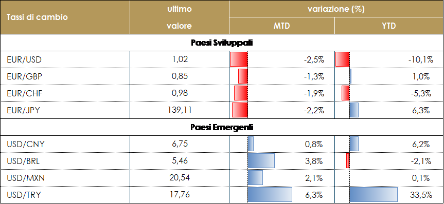 A cura del team Core Equity Value di MB SGR VIEW STRATEGICA La view sul comparto azionario continua ad essere costruttiva per un trimestre che, pur con una certa volatilità, presenta una buona crescita degli utili e una stagionalità attraente per le attività finanziarie rischiose. Tra i rischi a questo scenario un certo grado di rallentamento macroeconomico, la normalizzazione della politica monetaria (che potrebbe risentire di un tasso di inflazione più alto più a lungo) e i timori sul mercato immobiliare cinese. Azionario USA: I trend di lungo termine proseguono su traiettorie al rialzo sostenibili, il ciclo economico (pur in rallentamento) è ancora favorevole e le condizioni finanziarie rimangono accomodanti. Nell’attuale contesto geopolitico l’area statunitense appare favorita alla luce di 3 fattori: l’indipendenza energetica la rende meno fragile ai rialzi dell’oil, il livello dell’interscambio commerciale con la Russia è modesto ed infine la composizione dell’indice azionario la rende più resiliente agli attuali rischi. Azionario Europe: L’attuale situazione geopolitica e la dipendenza energetica dell’EMU suggeriscono di portare a neutrale l’esposizione sul settore. L’incertezza geopolitica resta, tuttavia, bilanciata da politiche fiscali espansive, marcato accomodamento monetario e dalla debolezza dell’EURO. Elementi di rischio da monitorare sono legati a un possibile inasprimento delle operazioni militari e alle conseguenti contromisure economiche. TASSI DI CAMBIO La scorsa settimana l’apprezzamento del dollaro USA ha subito una battuta d’arresto. Il Dollar index ha perso poco meno dell’1%. Le valute con la miglior performance sono state quelle dei paesi esportatori di materie prime: nel G10 la corona svedese, il dollaro australiano e la corona norvegese si sono apprezzati rispettivamente del 2,2%, dell’1,9% e dell’1,8%. Il dollaro australiano è stato sostenuto anche dall’aumento dei tassi, che scontano ulteriori rialzi da parte della RBA nel corso delle prossime riunioni. La decisione della BCE di effettuare un rialzo di 50 bps (invece dei 25 bps preannunciati dalla Presidentessa Lagarde solo pochi giorni prima della riunione) e l’annuncio dell’introduzione del nuovo Transmission Protection Instrument (TPI) hanno contribuito a spingere l’euro al di sopra di 1,02. Tuttavia, i pessimi dati PMI dell’euro, pubblicati venerdì mattina, hanno pesato sull’euro che ha chiuso la settimana in ribasso. Nei mercati emergenti, la valuta migliore è stata il Peso cileno, che si è apprezzato di oltre il 5% rispetto al dollaro USA. La timida stabilizzazione del prezzo del rame, dopo un calo di quasi il 30% registrato dall’inizio di giugno, ha aiutato la valuta. Lo zloty polacco e il fiorino ungherese si sono piazzati rispettivamente al secondo e al terzo posto nella classifica EM: dopo settimane di deprezzamento, un aggiustamento delle posizioni degli investitori è probabilmente la ragione principale della loro forza. La lira turca ha chiuso la settimana in fondo alla classifica: ha perso quasi il 2% dopo che la Banca centrale ha deciso di mantenere invariati i tassi di politica monetaria, anche se l’inflazione si è attestata a un massimo pluridecennale del 78%. A cura del team obbligazionario di Mediobanca SGR