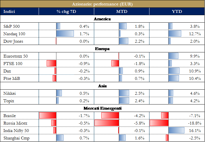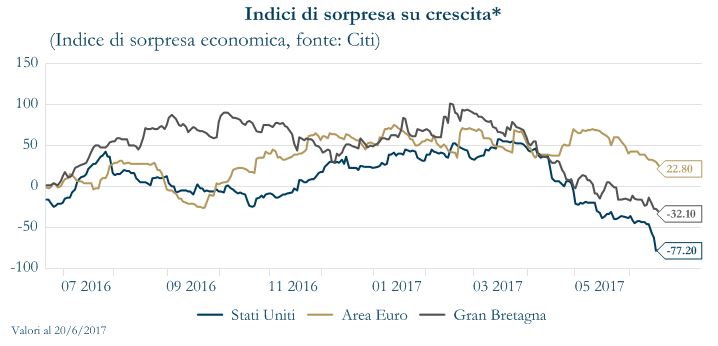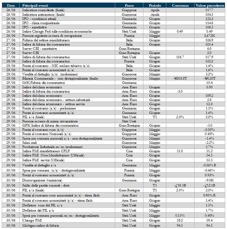 MERCATI AZIONARIMercati europei intorno alla pari, appesantiti dai ribassi del prezzo del petrolio ma sostenuti dall’aumentata propensione al rischio innescata dall’ultima riunione della BCE e dalla vittoria del movimento di Macron alle legislative francesi. I prezzi del greggio pesano anche sui listini statunitensi, che beneficiano tuttavia dei diversi interventi degli esponenti della Fed accomunati da rassicurazioni circa la tenuta del mercato del lavoro e dall’approccio graduale che la banca centrale intende usare nel percorso di normalizzazione della politica monetaria. Si riprendono i titoli tecnologici sul Nasdaq dopo il sell-off della scorsa settimana. Il Giappone chiude la settimana in positivo, grazie alla svalutazione dello yen e alle parole del vicegovernatore della BoJ Iwata, che ha negato la necessità di un rialzo dei tassi nel breve termine. Gli indici cinesi sono poco mossi, ma anche qui notizie positive giungono dall’inclusione negli indici MSCI di alcuni titoli scambiati sulle piazze continentali (MSCI aggiungerà 222 Large Cap cinesi all’indice MSCI Emerging Markets, pari a un ponderazione di circa lo 0,73%) e dalle dichiarazioni della PBoC, che non restringerà il proprio portafoglio titoli nel corso di quest’anno.  1f
