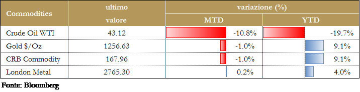 MATERIE PRIMEIeri il prezzo del petrolio sembra essersi stabilizzato sopra 45 dollari al barile, dopo i forti cali registrati in settimana. Il movimento dell’ultimo mese ci ha riportato ai livelli che hanno caratterizzato gran parte del 2016 Alla base di questo calo del prezzo del petrolio vi sono diversi fattori: primo fra tutti il basso prezzo di break-even della produzione di shale–oil e le elevate scorte all’interno dei paesi OECD, nonché il ritorno sul mercato delle forniture africane, le preoccupazioni per la tenuta del settore manifatturiero cinese.  2f