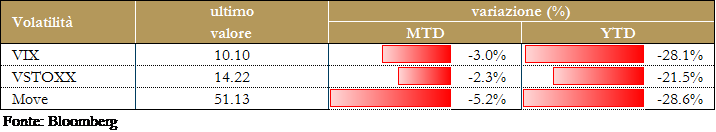 VOLATILITA’A partire dal primo trimestre 2016 la volatilità degli attivi ed in particolare quella delle azioni è scesa e si mantiene a livelli storicamente bassi.  3f
