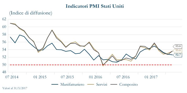 I dati congiunturali diffusi negli ultimi mesi hanno riservato soprese negative, portando ad esempio l’indice di sorpresa di Citi a -77.20 punti. In T1 2017 la spesa per consumi ha rallentato, nonostante il rafforzamento del mercato del lavoro e il clima di fiducia solido. La debolezza dei consumi delle famiglie è proseguita anche nei primi due mesi di T2 2017: nel mese di maggio le vendite al dettaglio hanno registrato la diminuzione più marcata da inizio 2016, guidate dalle vendite relative ad auto ed elettronica. Questa debolezza sorprende, perché le condizioni finanziarie restano molto accomodanti. Nonostante i due rialzi del costo del denaro da parte della Fed, la struttura a termine governativa si è appiattita e il tasso decennale è scivolato sotto il 2,2%, i prezzi azionari hanno continuato a salire e il dollaro si è deprezzato, più che compensando l’aumento del costo del denaro. Allo stesso tempo, la probabilità di stimolo fiscale continua a diminuire come conseguenza dell’assenza di risultati sulle riforme annunciate ad inizio anno dall’amministrazione Trump. Una maggior spinta positiva dovrebbe, invece, derivare dalle altre componenti, esportazioni nette e investimenti. Una crescita mondiale sincrona, quale quella attuale, implica un miglior equilibrio tra esportazioni e importazioni. Inoltre, gli investimenti dovrebbero rafforzare la dinamica vista nel primo trimestre. Infatti, nonostante le indicazioni provenienti dagli indici PMI mostrino una decelerazione della crescita rispetto ai massimi dell’anno scorso, gli investimenti sono maggiormente correlati alla produzione che non alle survey e la produzione manifatturiera in aprile è cresciuta al ritmo più elevato da febbraio 2014.  In questo contesto, le stime anticipatrici del PIL elaborate dai dipartimenti della Fed mostrano un possibile rimbalzo nel secondo trimestre: l’indicatore della Fed di New York indica una crescita pari a 1.4%, mentre quello della Fed di Atlanta azzarda addirittura un 2.9%. Riteniamo che nel 2017 l’accelerazione del PIL statunitense resterà moderata e solo leggermente al di sopra del potenziale. La Fed stima una crescita media annua del 2% nel 2017, con una crescita potenziale compresa tra 1.5% e 1.75%.  A nostro avviso, la moderazione del ritmo di crescita della crescita degli Stati Uniti in un contesto di ripresa mondiale sincrona, suggerisce una maggior diversificazione del portafoglio azionario.