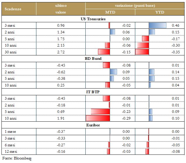 MERCATI DEI TITOLI DI STATOSettimana priva di spunti sul mercato obbligazionario statunitense con la struttura a termine governativa sugli stessi livelli di settimana scorsa che vede consolidarsi il movimento di flattening delle settimane passate. I mercati prezzano una Fed più dovish e un’economia statunitense più debole di quanto dichiarato la settimana scorsa da parte del FOMCAnche la struttura a termine tedesca ha registrato in settimana solamente movimenti marginali. Settimana positiva per i titoli obbligazionari italiani che beneficiano della vittoria di Macron e vedono lo spread rispetto al Bund ai minimi da gennaio, in una settimana povera di spunti dal lato macroeconomico.  Grafico 4 - Mercati dei titoli di stato
