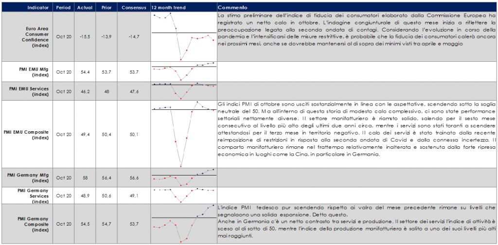 L’ulteriore calo dell’indice PMI composito dell’Area Euro in ottobre aggiunge ulteriore evidenza che la seconda ondata di infezioni, e la nuova ondata di misure di contenimento, sta avendo un pesante effetto sull’economia dell’Area.
