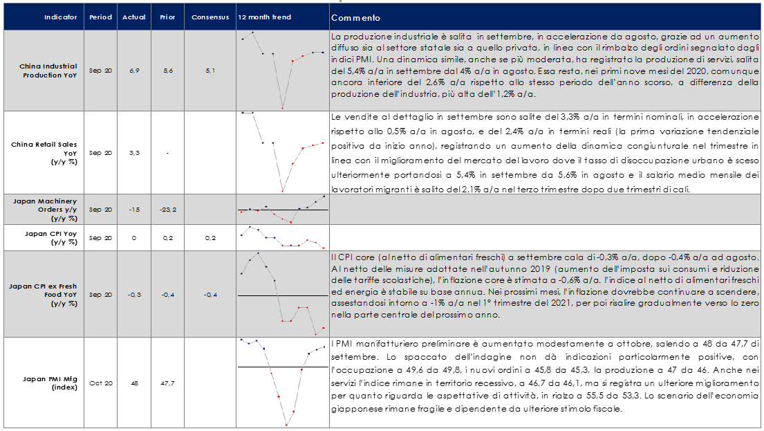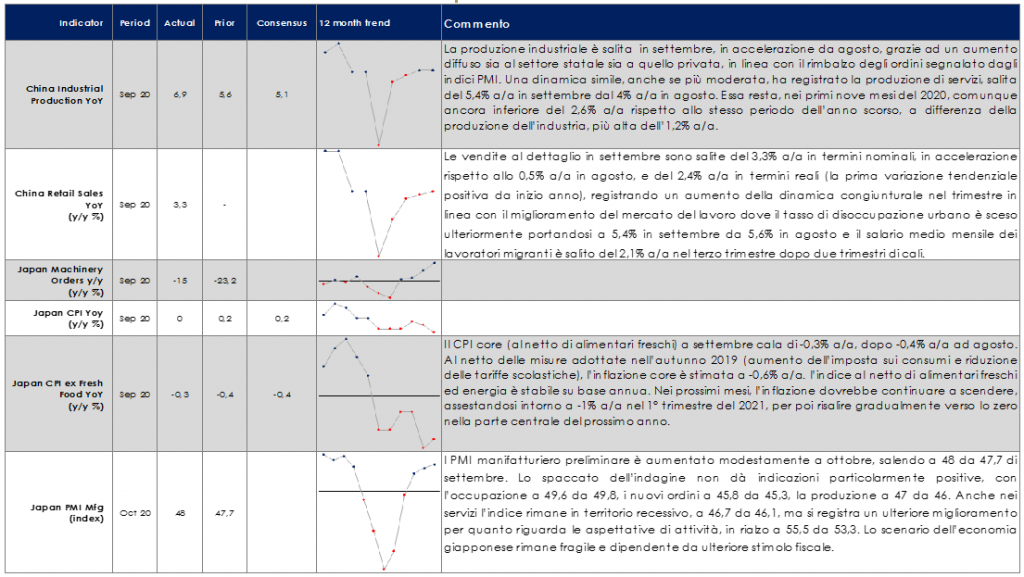 In Cina il PIL è salito del 4,9% a/a in T3 con un aumento del 2,7% t/t sul trimestre precedente, dopo la ripresa a V tra il 1° e il 2° trimestre. L’accelerazione dell’attività è stata diffusa a tutti i settori, con la dinamica dell’industria (+6% a/a da 4,7% nel 2° trimestre) ancora superiore a quella dei servizi (+4.3% a/a da 1,9% a/a nel 2° trimestre).