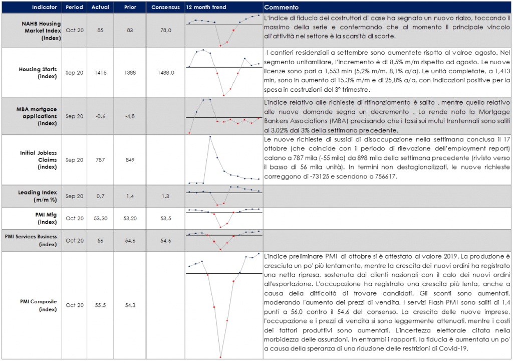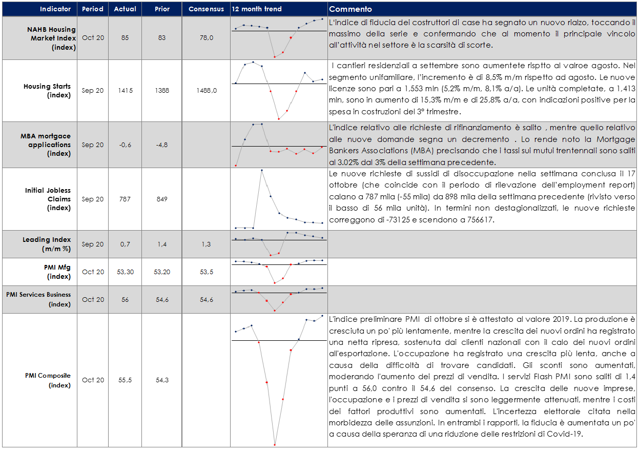 - Impatto sulla fiducia degli operatori economici: l’incertezza sull’esito delle elezioni potrebbe gravare ulteriormente sulla fiducia di imprese e consumatori, già indebolita dalla pandemia, ritardando le decisioni di investimento ed aumentando il risparmio precauzione. Viceversa, è chiaro che l’esito delle elezioni determinerà la traiettoria di ulteriori stimoli fiscali, nonché la svolta attesa per la politica fiscale. Una chiara vittoria di uno dei due candidati potrebbe accelerare le trattative sugli stimoli fiscali e chiarire verso quale fascia della popolazione saranno indirizzati. Comunque, in caso si verificasse un ulteriore shock di fiducia la Fed avrebbe i mezzi per contrastarlo, mantenendo lasche le condizioni finanziarie e facilitando il flusso del credito. La Fed potrebbe anche accelerare il programma di QE, acquistando titoli del Tesoro e MBS a un tasso più rapido, soprattutto in caso di timori di liquidità del mercato.