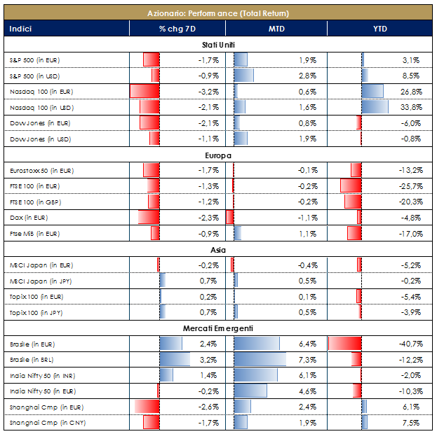 MERCATI AZIONARI T3 estremamente migliore vs aspettative, mercati ancora negativi. Value is back in town? Investitori ancora confusi su chi sarà il prossimo Presidente degli Stati Uniti d’America, nonostante il vantaggio dei sondaggi a favore di Biden. Lo scenario di coda, che i mercati azionari temono di più, è quello di un’elezione dall’esito contestato, con annessi ritardi e strumentalizzazioni del voto. Uno stallo prolungato contribuirebbe ad una fase di risk-off ed elevata volatilità. Non è da escludere, per alcuni analisti, la possibilità che la situazione degeneri in una vera e propria crisi delle istituzioni. La curva dei futures sull’indice di volatilità VIX non incorpora ancora scenari così negativi e rimane lontana dai massimi degli ultimi mesi, registrati a inizio settembre, ma in ogni caso è in risalita dalle ultime osservazioni. L’aumento dei contagi e le nuove misure restrittive adottate dai Governi europei è un fattore aggiuntivo all’incremento della volatilità. Come anticipato settimana scorsa, la stagione degli utili del terzo trimestre non sembra (per il momento) riuscire a dare giustizia ai mercati, nonostante la maggior parte dei risultati riportati fino ad ora siano stati ben superiori alle aspettative: circa un terzo delle società dell’S&P 500 ha riportato e sulla base dei risultati dichiarati fino ad ora, le stime sono state riviste al rialzo; la riduzione degli EPS e dei ricavi sono ora previste a -18.5% (vs -21.5% precedente) e -3.8% (vs -4.5%), rispettivamente. In Europa, circa un quinto delle società presenti nell’indice STOXX600 ha riportato fino ad ora i risultati con ampie sorprese lato settori ciclici ed industriali. Le stime di EPS sul 2021 per l’indice europeo STOXX600 sono invariate da metà luglio, dopo essere state tagliate del 23% da inizio anno. Gli utili di quest’anno sono stati ridotti del 40%, e la previsione è che circa l’80% venga recuperato l’anno prossimo. In termini di performance abbiamo assistito ad una prima overperformance del Value vs Growth: SXXE -1% con Banks +4%, Travel&Leisure +1.30%, Auto +1.10%, Media +1% (primi settori a beneficiare maggiormente della rotation) contro Tecnologia -4.45%, Consumer -3%, Basic Resources -2.30%. A livello di single names, Ryanair +10.80%, Lufthansa +10.50%, SES +10%, Banco Santander +6.55%, Airbus +6.20% e Safran +6% i best contro i peggiori Hellofresh -13%, DeliveryHero -12%, SAP -6%, Deutsche Boerse -5.60%, Kone -5% e Kering -5% (nonostante i risultati migliori vs aspettative ma con una leggera debolezza del main brand Gucci, soprattutto in Asia, e considerando gli ottimi risultati dei competitor LVMH ed Hermes i quali hanno alzato l’asticella delle aspettative). In Italia, FTSE MIB -0.30% trainato da Pirelli +10%, Moncler +4.85%, Tenaris +4% contro TIT -5.80%, Prysmian -5.40% e Interpump -4.50%; mercato delle MidSmall Cap -1.50% con Saras +19% e Falck Renewables -11%. S&P500 -0.90% trainato da Auto +12%, HealthCare +11% e Dept Stores +9.70% contro Homebuildings -10% e Trucking Idx -6%. Nasdaq100 -2% con Netflix -10.45% (a seguito di un numero inferiore di nuovi users vs aspettative). A cura del team Core Equity Value di MB SGR PERFOMANCE MERCATI AZIONARI – Dati aggiornati alle ore 17.30 del 23 ottobre 2020 VIEW STRATEGICA: l’ampia liquidità messa a disposizione dalla Banche Centrali, gli interventi di stimolo fiscale e i possibili flussi in ingresso sosterranno un ulteriore recupero del ciclo economico che supporterebbe il trend positivo dei mercati. |