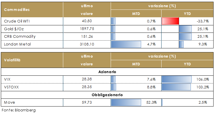MATERIE PRIME E VOLATILITA’ Il prezzo del petrolio è rimasto stabile durante l’ultima settimana appena conclusasi. Il contesto di fondo resta influenzato negativamente dai timori riguardo agli impatti sulla domanda derivanti da nuove restrizioni per via del crescente aumento dei contagi. I dati di questa settimana relativi alle scorte di benzine negli Stati Uniti hanno alimentato le preoccupazioni di una riduzione dei consumi alla vigilia della festività del Ringraziamento e della stagione natalizia. In generale, i prezzi delle materie prime durante gli ultimi due mesi hanno mostrato una bassa volatilità, intrappolati tra una prospettiva rialzista a più lungo termine derivante da migliori aspettative di crescita per il 2021 e i timori a breve termine derivanti dall’aumento delle infezioni in tutta Europa e nel Midwest degli Stati Uniti. Tuttavia, è importante sottolineare che quasi tutti i mercati delle materie prime sono in deficit o si stanno muovendo verso una situazione di deficit. Dato che la domanda globale per le materie prime legate al consumo come il petrolio rimane debole, i deficit sottolineano ulteriormente quanto sia stato significativo il calo dell’offerta e quanto sia cambiata la funzione di risposta dell’offerta durante la pandemia. PERFORMANCE – Dati aggiornati alle ore 17.30 del 23 ottobre 2020 Il mercato inizia a concentrarsi molto di più sulle elezioni presidenziali statunitensi: la probabilità di una “Blue wave” (i democratici vincono tutto: Presidente, Camera e Senato) è in aumento e, di conseguenza, il dollaro tende a indebolirsi. Biden vuole sostenere la fragile economia statunitense con un massiccio stimolo fiscale, del valore di oltre 2.000 miliardi di dollari. Il piano farà sì che il deficit rimanga molto elevato anche nel 2021 e questo significa che la FED probabilmente continuerà ad ampliare il suo bilancio. Il dollaro USA ha chiuso la settimana come la valuta più debole nello spazio del G10, perdendo più dell’1% rispetto all’euro.L’esito delle elezioni presidenziali statunitensi continua ad essere il principale driver nelle valute dei mercati emergenti. Il dollaro USA si è indebolito contro quasi tutte le valute durante la settimana. Un’amministrazione democratica dovrebbe essere meno aggressiva nei confronti dei Paesi emergenti rispetto all’amministrazione gestita da Trump. I principali beneficiari sono state le valute dei Paesi dell’America Latina (Colombia e Messico). A cura del team obbligazionario di Mediobanca SGR PERFORMANCE TASSI DI CAMBIO – Dati aggiornati alle ore 17.30 del 23 ottobre 2020 VIEW STRATEGICA: con l’incupirsi delle prospettive per l’economia globale, il dollaro USA si avvantaggerà del suo ruolo di valuta rifugio. |