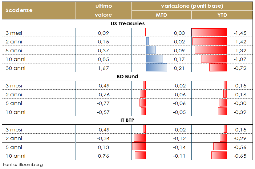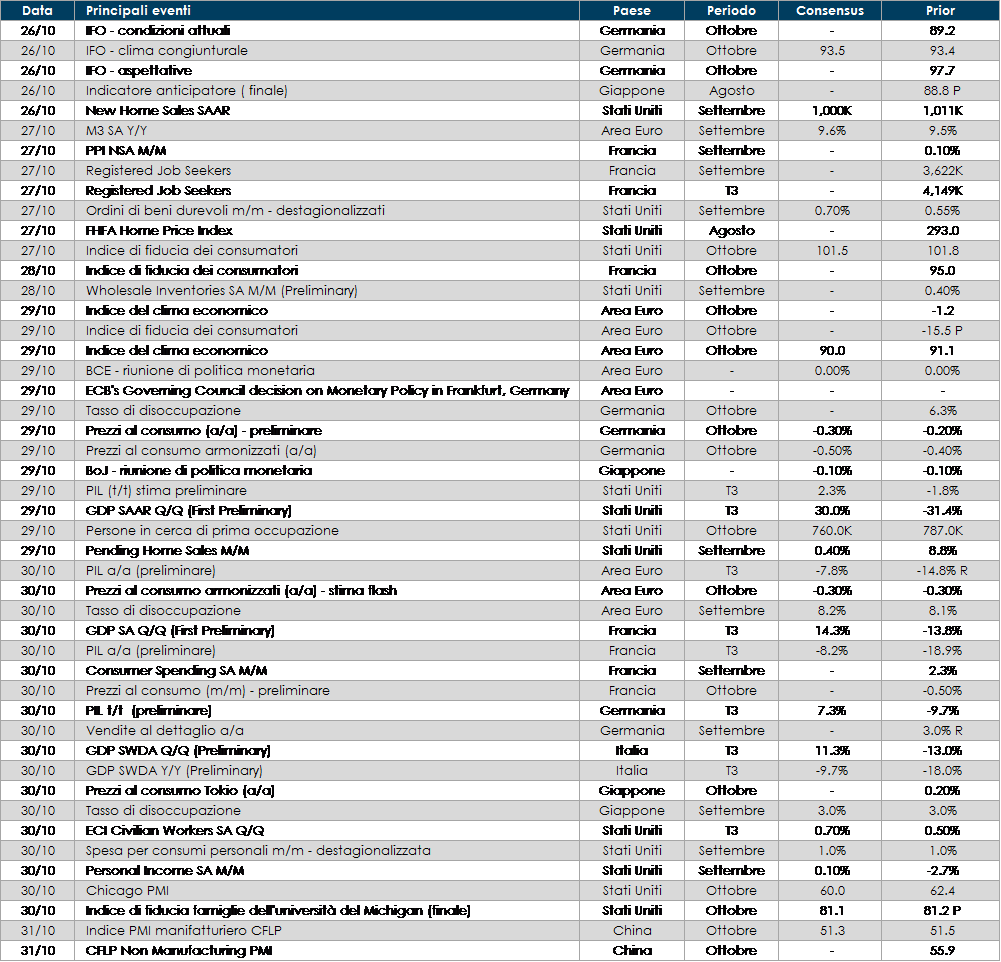 I rendimenti governativi statunitensi sono aumentati, portando lo spread di 10y Bund-UST ai livelli più alti da marzo di quest’anno. Questo movimento, guidato dal segmento a lungo termine della curva dei rendimenti, potrebbe accelerare dopo le elezioni presidenziali.In Europa, il principale evento è il sindacato delle prime emissioni delle obbligazioni dell’Unione Europea, per il finanziamento del programma europeo SURE a sostegno dell’occupazione. L’operazione di doppia tranche ha attirato un portafoglio ordini da record di 233 miliardi di euro, di gran lunga il più grande mai registrato per un emittente sovrano o SSA. La tranche a dieci anni è stata piazzata per 17 miliardi di euro a fronte di una domanda record da 145 mld di euro. La seconda tranche a 20 anni sarà invece di 7 miliardi di euro a fronte di richieste che hanno superato gli 88 mld di euro. Ciò si spiega in parte con il nuovo premio di emissione in offerta, in parte con la scarsità di emissioni nette di bond dell’Area Euro. La settimana prossima l’attenzione dei mercati sarà rivola al meeting della BCE, che dovrà modellare la propria comunicazione alla luce dell’evoluzione epidemiologica e delle deludenti indicazioni soprattutto sul fronte dei prezzi. Anche se non è attesa nessuna decisione per questo mese, con l’inflazione ferma ben al di sotto dell’obiettivo, la BCE segnalerà maggiore fiducia di poter rafforzare il proprio programma di acquisto di attività per sostenere l’economia durante la seconda ondata del virus. Questa settimana, il Presidente della BCE Christine Lagarde ha sottolineato che il riemergere di casi nelle ultime settimane rappresenta un “chiaro rischio” per la ripresa. PERFOMANCE DEI TITOLI DI STATO – Dati aggiornati alle 17.30 del 23 ottobre 2020 VIEW STRATEGICA Governativo US: il massiccio intervento di politica monetaria espansiva della Fed ha riportato i rendimenti governativi abbondantemente sotto l’1% sulle principali scadenze. Alla luce della volatilità nell’attuale fase (possibili ulteriori tagli e funzione di hedge) manteniamo una view neutrale.. Governativo Euro Nonostante l’allentamento monetario, non si identifica valore in questa asset class a fronte di rendimenti ampiamente negativi in particolare delle emissioni tripla A. |