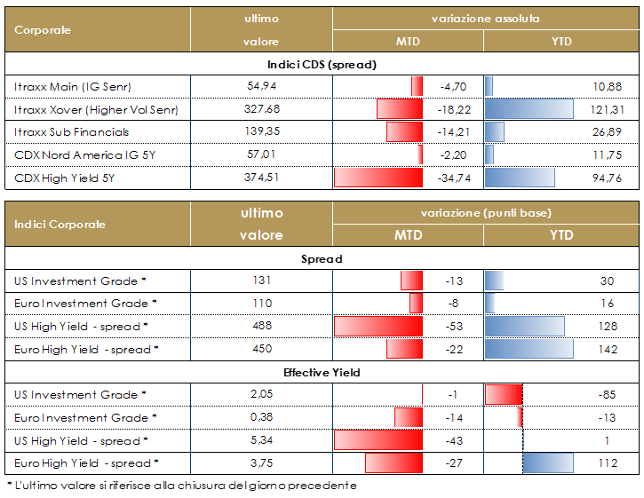 Il mercato corporate ha scambiato in un range molto stretto per tutta la settimana guidato sostanzialmente dalle notizie dagli USA sull’avanzamento dei negoziati per ulteriori stimoli fiscali e dai nuovi numeri, negativi soprattutto in Europa, sull’andamento della pandemia.Il mercato del credito è rimasto abbastanza resistente e immune alla volatilità azionaria e alla fase di risk-off relative sul secondario. Gli spread su indici CDS sostanzialmente in lieve allargamento in Europa con IG (Itraxx Main) che ha chiuso la settimana a +1, mentre su HY (Itraxx Xover) +2bp. Anche in US dinamica degli spread in linea con allargamento di 1bp su IG e di 2bp su HY.Il mercato primario questa settimana su corporate non è stato particolarmente intenso con 5,65 miliardi di euro con book sottoscritti 3,5 volte e 25-30bps di revisione da price talk a fronte di una cospicua attività su SSN e Governativi dove oltre al nuovo bond comunitario SURE ci sono state le emissioni del nuovo 30y Italia e del nuovo bond Greco 15y.Su corporate due nuove emissioni hanno riguardato il settore immobiliare con Blakstone Property e Ca Immobilien. Su financial oltre al senior di Morgan Stanley e di CaixaBank, segnaliamo Investitor AB Senior ha avuto richieste per 5 volte con una domanda di 3,1 miliardi di euro per 600Mio euro a 15 anni. Su Utility, A2A ha emesso nella parte lunga della curva (500Mio 12y). Altroo deal significativo in questa fase il dual tranche ibrido di Iberdola (1,6Bio Perp nc5.5,1,875% e 1,4Bio Perp nc8.5, 2,25%) con un book finale di 7Bio di euro.Da segnalare infine alcuni nuovi deal su HY: Drax, Garfunkelux, Ineos tutti in chiusura di settimana e ben accolti dal mercato. A cura del team obbligazionario di Mediobanca SGR PERFOMANCE DEI TITOLI CORPORATE – Dati aggiornati alle 17.30 del 23 ottobre 2020 Corporate IG: l’easing monetario potrebbe sostenere ulteriormente l’asset class da preferire, soprattutto in Europa, rispetto al segmento più speculativo (high yield) e a quello governativo in quanto presenta un profilo rischio/rendimento i più interessante in questa fase di difficile previsione dell’evolversi dei rischi di scenario. Corporate HY: nonostante un ulteriore deterioramento dello scenario base potrebbe impattare gli emittenti più deboli riportando a livelli più elevati i tassi di default, l’entità delle politiche monetarie e fiscali si configurano come possibili elementi di stabilizzazione. |