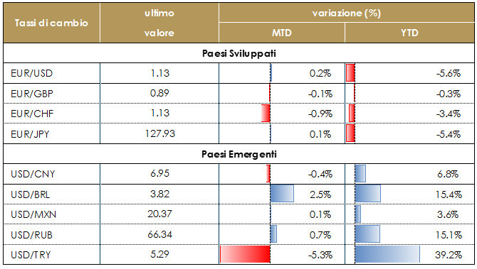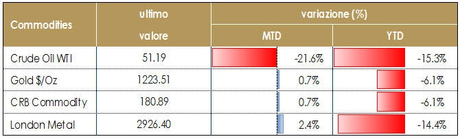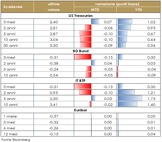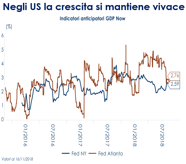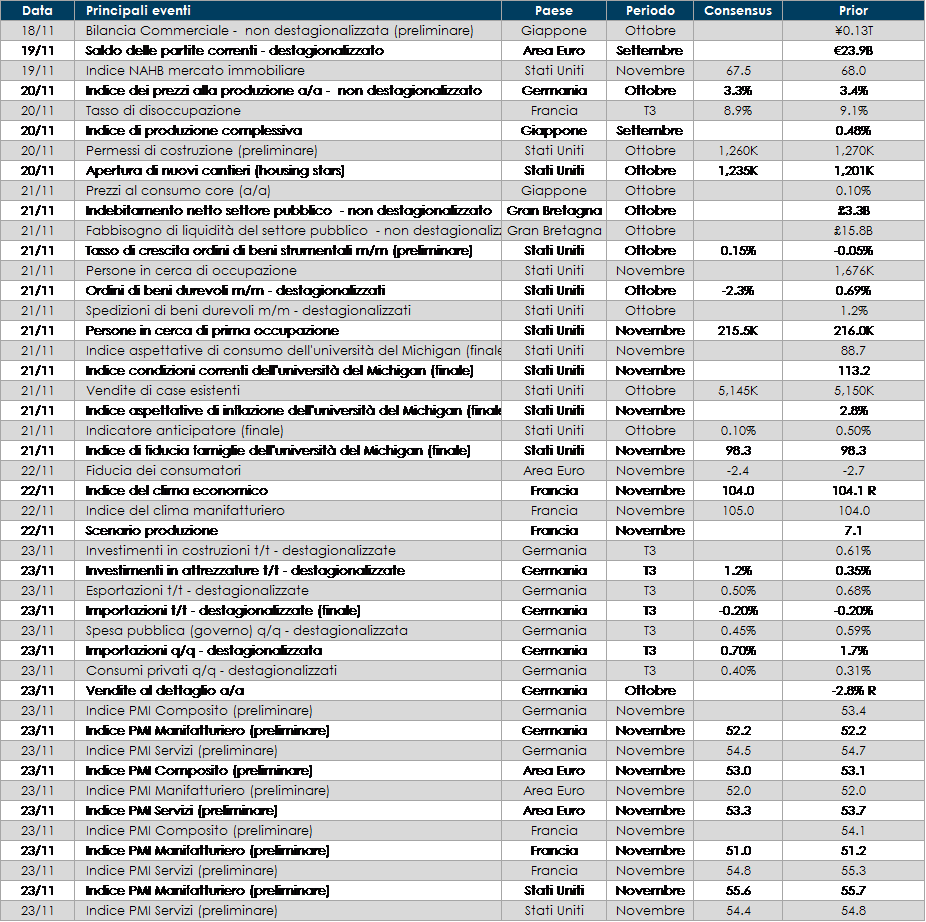 In settimana, la BCE ha pubblicato i verbali della riunione di politica monetaria del 24-25 ottobre, che contengono poche novità rispetto a quanto contenuto nella dichiarazione introduttiva e nelle osservazioni del Presidente Draghi durante la conferenza stampa: la BCE continua a ritenere che l’inaspettata debolezza dell’attività in T3, “tenendo conto del ruolo degli sviluppi temporanei e settoriali, non sia tale da modificare significativamente le prospettive per l’Area e l’espansione economica in corso sia rimasta ampiamente valida”. Questa valutazione supporta l’opinione espressa da Draghi nel suo discorso al congresso bancario di Francoforte della scorsa settimana, che ha ribadito che le prospettive per la politica monetaria annunciate a giugno – il termine degli acquisti di asset a fine anno e un primo rialzo dei tassi a partire da ora – sono rimaste sulla buona strada. L’indice dei prezzi al consumo dell’Area Euro in ottobre, secondo la lettura definitiva, è salito del 2.2% a/a, in linea con le previsioni e con il dato preliminare, mentre la componente core si è attestata 1.1% a/a. L’indice dei prezzi al consumo dell’Area Euro in ottobre, secondo la lettura definitiva, è salito del 2.2% a/a, in linea con le previsioni e con il dato preliminare, mentre la componente core si è attestata 1.1% a/a. USA: rallentamento del mercato immobiliare statunitenseL’indice NAHB sull’andamento del mercato immobiliare statunitense nel mese di novembre si è attestato a 60 punti, in discesa rispetto ai 68 di ottobre. Secondo gli analisti, l’aumento dei tassi sull’ipoteche e dei prezzi rende il mercato sempre meno accessibile per i costruttori, sottolineando come il sentiment sia sceso di 8 punti toccando il suo minimo da agosto 2016. Tuttavia, ad ottobre, il numero di cantieri aperti per la costruzione di nuove case è salito dell’1.5% m/m a 1.228 milioni di unità, in linea con il consensus (mentre il dato di settembre è stato rivisto al ribasso da -5.3% a -5.5% m/m). Al contrario, i nuovi permessi di costruzione, sempre a ottobre, sono scesi dello 0.6% m/m a 1.263 milioni di unità, leggermente meglio delle attese. Ancora, gli ordini di beni durevoli negli Stati Uniti, secondo la lettura preliminare di ottobre, sono scesi del 4.4% m/m, decisamente superiori rispetto alle attese degli economisti, che si aspettavano una diminuzione del -2.6% m/m. Gli ordini ex-trasporti sono aumentati dello 0.1% m/m, meno del consenso che stimava un +0.4% m/m. Gli ordini ex-difesa sono diminuiti dello 1.2% m/m. In ultima istanza, l’indice di fiducia dei consumatori elaborato dall’università del Michigan, secondo la lettura definitiva di novembre, si è attestato a 97.5 punti, al di sotto della stima preliminare a quota 98.3 punti.