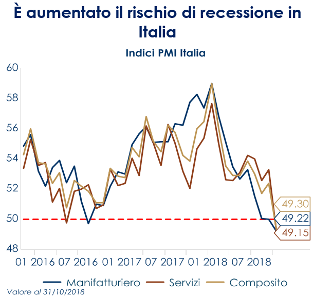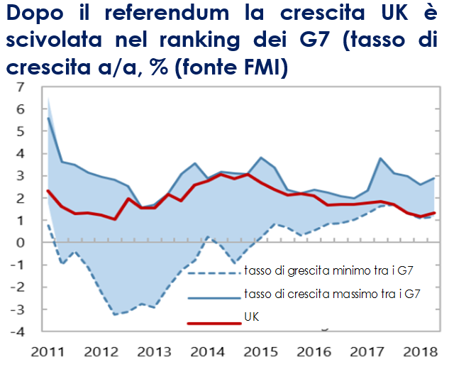 | Nelle ultime settimane si sono registrate delle variazioni di prezzo particolarmente negative su diverse asset class. Il mercato si sta interrogando se l’espansione del ciclo economico globale sia giunta al termine. Negli ultimi mesi la crescita mondiale si è ricomposta a favore degli USA, a fronte di una decelerazione superiore delle attese dell’Area Euro e del Giappone. Infatti in T3 la crescita economia dell’Area è rallentata a seguito della contrazione dell’economia tedesca e alla stagnazione italiana, a fronte di una modesta accelerazione in Francia e di un tasso di crescita costante in Spagna. Contestualmente, in Giappone il PIL di T3 ha subito un calo pari a -1.2% a/a a seguito dei recenti disastri naturali. Resta, invece, vivace la crescita negli USA. In Cina, il rallentamento della crescita è imputabile alla concomitanza delle tensioni commerciali e degli effetti della riduzione della leva finanziaria implementata dalle autorità cinesi nel 2017. A nostro avviso nel 2019 l’economia globale è destinata a rallentare moderatamente. Si tratterà però di una crescita al di sopra del potenziale nella maggior parte delle economie sviluppate e sarà accompagnata da un ulteriore miglioramento del mercato del lavoro e da un graduale aumento dell’inflazione di fondo. Ci aspettiamo che la crescita US si normalizzi sopra il 2.5%, quella cinese torni a stabilizzarsi in virtù dello stimolo monetario e fiscale implementato dalle autorità cinesi negli ultimi due trimestri (la PoBC ha ridotto 4 volte il coefficiente di riserva obbligatoria e ha iniettato liquidità nel sistema bancario. E’ stato approvato un piano di riduzione delle imposte sui redditi delle persone fisiche e sono stati proposti tagli e incentivi per le società colpite dai dazi e quelle tecnologiche). In Giappone la perdita di crescita è temporanea ed imputabile alle catastrofi naturali, si dovrebbe quindi assistere ad un rimbalzo in T4. Lo scenario in Europa appare più incerto. Da un lato, si è avuto una perdita di dinamica di crescita, imputabile al rallentamento del settore automobilistico tedesco, che ha risentito del passaggio alla normativa WLTP, dell’escalation della guerra commerciale USA-Cina e del rallentamento della domanda cinese (imputabile anche all’aumento delle tasse sulle vendite di auto in Cina dal 5% al 10 % in gennaio 2018). Dall’altro, due rischi politici minano l’evoluzione della congiuntura europea: il processo di Brexit e il rischio Italia. Se è vero che la debolezza del comparto automobilistico ha pesato sulla crescita in T3, vale la pena notare che il PMI di ottobre non ha recuperato la debolezza del PIL di T3, quindi non ci si può ancora aspettare un forte rimbalzo in T4. Inoltre, l’esito della trattativa relativa alla Brexit è ancora incerto. Per ora UE e UK hanno raggiunto un accordo sul trattato di recesso che limita i danni economici della Brexit, prevedendo un periodo transitorio durante il quale non vi saranno effetti sostanziali e, poi, il mantenimento a tempo indeterminato di UK in una unione doganale con l’UE. L’incertezza sui mercati si origina dal fatto che il Governo Britannico non sembra avere i numeri per ratificarlo in Parlamento ed i conseguenti costi economici di un eventuale mancato accordo sarebbero elevati sia per UK sia per l’intera Area Euro. In Italia, invece, è aumentata la probabilità di una recessione nei prossimi trimestri: il PMI composito, indicatore anticipatore del PIL in ottobre è sceso inaspettatamente al di sotto della soglia di espansione a 49.2, un livello storicamente coerente con la crescita negativa del PIL. Il divario tra il PMI italiano manifatturiero e composito rispetto al resto dell’Area Euro a ottobre si è ampliato al livello più alto dalla crisi dell’euro, suggerendo chiaramente una debolezza idiosincratica. | Dopo il referendum la crescita UK è scivolata nel ranking dei G7 (tasso di crescita a/a, % (fonte FMI)