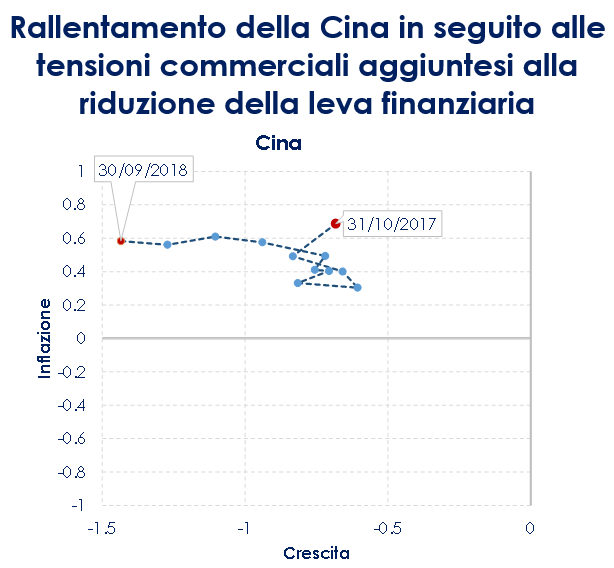 Rallentamento della Cina in seguito alle tensioni commerciali aggiuntesi alla riduzione della leva finanziaria