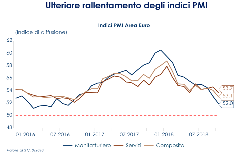 Gli indici PMI di novembre sono stati al di sotto delle attese. L’indice PMI manifatturiero si è attestato a 51.5 (consenso 52.0, valore precedente 52.0), l’indice dei servizi a 53.1 (consenso di 53.5, valore precedente 53.7). La debolezza è imputabile alla caduta delle esportazioni, penalizzata da un rallentamento dell’economia globale e dalla guerra commerciale in corso tra Stati Uniti e Cina. Conseguentemente il PMI composito è sceso a 52,4, il livello più basso dalla fine del 2014 (consenso 53, valore precedente 53,1). ll calo dell’indice composito sembra essere stato guidato da una domanda interna più debole. Il nuovo indice degli ordini di esportazione è rimasto invariato al suo livello minimo registrato lo scorso mese, pertanto, il calo dell’indice degli ordini totali è ascrivibile a una domanda interna più debole. A livello dei singoli paesi, anche gli indici PMI tedeschi deludono nettamente le stime, scendendo a 51.6 per il manifatturiero e a 53.3 per i servizi, rispetto ai 52.2 e 54.7 di ottobre. Rispecchia le stime, invece, il PIL tedesco finale di T3, che scende dello 0.2% t/t e sale dell’1.1% a/a.