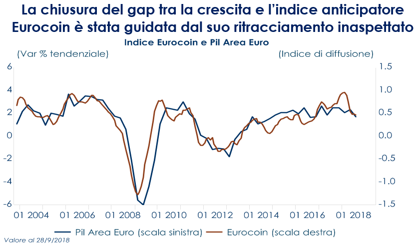 | Ulteriore rallentamento degli indici PMI | La chiusura del gap tra la crescita e l’indice anticipatore Eurocoin è stata guidata dal suo ritracciamento inaspettato |