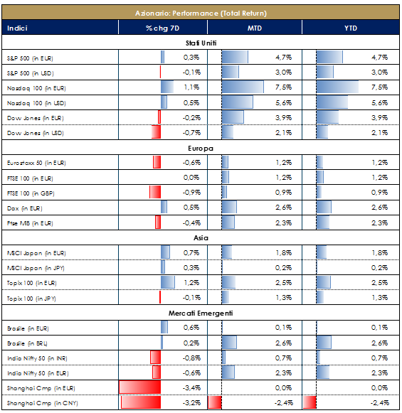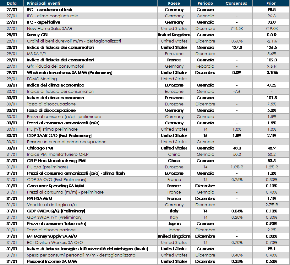 - Europa: la prossima settimana sarà pubblicata la lettura anticipata del PIL di T4, insieme all’inflazione preliminare di gennaio e agli indici della fiducia per l’Area Euro nel suo complesso. A livello di singoli paesi saranno pubblicati PIL e gli indicatori di fiducia in Italia, PIL e CPI i in Francia e Spagna, mentre in Germania l’attenzione sarà rivolta su CPI e indici IFO di gennaio.