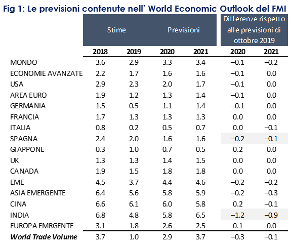 | Il FMI ha presentato a Davos l’aggiornamento delle sue previsioni per l’economia globale. Questa mostra segni di stabilizzazione, con una ripresa che si delinea ancora fragile e modesta. Il calo della produzione manifatturiera e del commercio mondiale sembra aver raggiuto il punto di minimo, supportato anche dal miglioramento nel settore automobilistico, mentre il settore dei servizi rimane in territorio espansivo, con una spesa per i consumi sostenuta dalla crescita salariale. Nel complesso tuttavia, almeno per il momento, non si sono ancora manifestati dei punti di svolta per il ciclo. Il miglioramento delle prospettive (la crescita mondiale nel 2020 è prevista più forte di quella del 2019) è dovuto alla combinazione di un allentamento della politica monetaria nel 2019 e di una distensione nella guerra commerciale statunitense con la Cina, durata quasi due anni. L’istituto ha quantificato questi due effetti, dichiarando che la “Fase 1” dell’accordo commerciale USA-Cina, anche se non modifica i picchi tariffari accumulati in questi mesi, ridurrà l’impatto negativo cumulato delle tensioni commerciali sul PIL globale dallo 0,8% allo 0,5% entro la fine del 2020, mentre l’allentamento monetario delle principali banche centrali ha sostenuto la domanda aggregata contribuendo per circa lo 0,5% alla crescita globale del 2019 (e a loro avviso farà lo stesso con a crescita mondiale nel 2020).