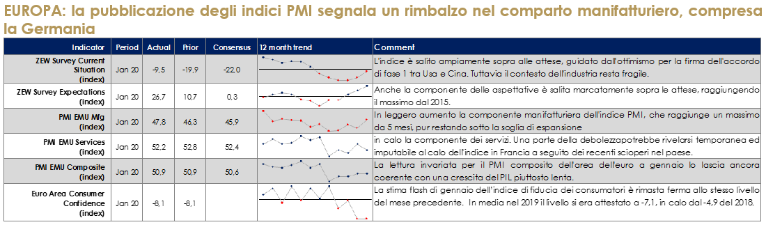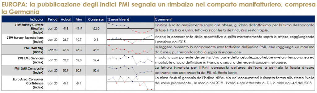 Gli indici PMI preliminari di gennaio offrono un’ulteriore prova della stabilizzazione dell’economia mondiale: le componenti più forward looking degli indici che indicano un graduale miglioramento e segnalano che le economie avanzate hanno probabilmente lasciato alle loro spalle il peggio.