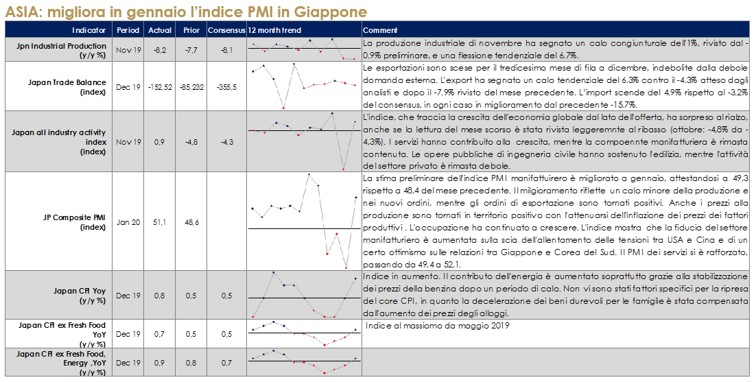 - Asia: settimana ricca di indicazioni macro di rilievo dal Giappone, tra produzione industriale, disoccupazione e vendite al dettaglio. Dalla Cina in arrivo i numeri degli indici PMI manifatturiero e servizi di gennaio.