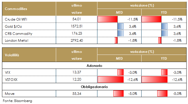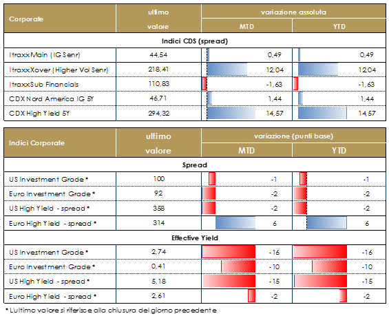 La settimana si conclude con una buona performance del comparto Investment Grade nonostante il peggioramento del risk sentiment a causa dei nuovi timori sulla diffusione e la contagiosità del coronavirus: gli spread si sono compressi in media 1/2 bps, con forte sovra-performance della carta cash rispetto agli indici. Giornate deludenti dal punto di vista del mercato primario: mentre la settimana passata aveva visto oltre €70 mld di nuove emissioni, questa settimana è stata poco intensa, complice la festività in America. Si conferma la prevalenza relativa da parte degli emittenti finanziari: da evidenziare in particolare la nuova emissione senior preferred MONTE 2.625% 2025 (che dopo solo una settimana dall’emissione del subordinato T2 è riuscita ad emettere altri €750 mln a fronte di una domanda superiore a €1.1 bln) e la nuova senior unsecured LLOYDS 0.375% 2025 (prima banca puramente UK a testare il mercato 2020 con una emissione in Eur: €750 mln offerti con domanda superiore a €2.1 bln). L’assenza di offerta sul primario ha sostenuto il mercato secondario che continua a beneficiare positivamente di una serie di fattori tecnici: i compratori continuano a essere superiori ai venditori (per dare un’idea, il rapporto buy:sell e’ di 68:32), con attività particolarmente vivace sulla carta a breve scadenza (sia finanziari che corporate) per parcheggiare la liquidità. Da segnalare inoltre la performance dei nomi italiani che continuano a mostrare una forte resilienza nonostante le vicende politiche interne: l’allargamento del BTP ha impattato il mondo del credito solo mezza giornata e quasi esclusivamente il settore financial (5 bps sulla carta senior nella giornata di mercoledì, maggiore debolezza degli AT1) ed è stata vista come occasione d’acquisto; sul dip sono subito arrivati compratori che hanno riportato gli spread flat. Sul fronte HY, il clima di tensione sui mercati sta penalizzando il comparto che chiude in allargamento per la terza seduta consecutiva: movimento comunque contenuto, considerata l’attività sul mercato primario, che ha portato l’indice Itraxx Xover a 214 bps dai 207 della scorsa settimana. A cura del team obbligazionario di Mediobanca SGR |