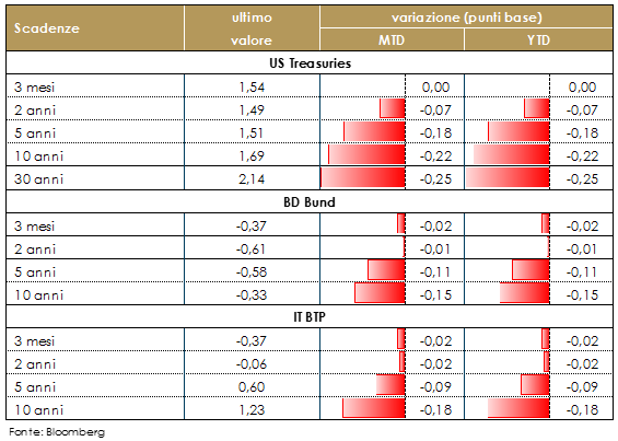 | MERCATI DEI TITOLI GOVERNATIVIA seguito dei timori di diffusione del coronavirus vi è stato un aumento dell’avversione al rischio, che ha portato ad una diminuzione dei rendimenti decennali dei paesi sviluppati. In Europa si è assistito ad un generalizzato movimento di bull flattening sulle curve governative, con gli investitori orientati ad allungare la duration dei portafogli. La riunione della BCE ha confermato la politica in essere, mentre ha formalmente annunciato l’avvio della revisione della strategia di politica monetaria. Il presidente Lagarde è sembrata meno dovish e ha riconoscendo che i dati puntano ad una stabilizzazione della crescita e i rischi restano rivolti verso il basso sebbene meno pronunciati. Sul fronte dell’inflazione ha sottolineato alcuni segnali di moderato aumento del sentiero core dell’inflazione. La settimana prossima, il meeting del FOMC presenterà poche sorprese. I segnali di miglioramento dei dati economici e la tregua tra USA-Cina dovrebbe rassicurare il FOMC a mantenere invariata la politica monetaria e ribadire che le prospettive economiche sono buone, le prospettive per il commercio internazionale sono migliorate sebbene rimangano alcune incertezze. Tuttavia, il mercato continua ostinatamente a prezzare un taglio di 25 pb entro la fine del 2020. Il meeting di politica monetaria della BoE sarà l’ultimo presieduto da Carney. Il mercato monetario prezza un taglio del base rate al 50%. | PERFORMANCE DEI TITOLI DI STATO