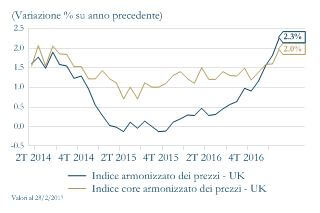 Il prossimo 29 marzo il Primo Ministro britannico, Theresa May, notificherà al Presidente dell’Unione Europea (UE) il ricorso all’articolo 50 del Trattato di Lisbona, manifestando ufficialmente l’intenzione di uscire dall’UE. Gli effetti immediati sull’economia britannica dell’avvio formale del processo di uscita dall’UE dovrebbero essere limitati, mentre nel medio periodo i rischi maggiori dovrebbero riguardare il settore dei servizi. In giugno l’esito inatteso del referendum ha inizialmente innescato una rimodulazione delle aspettative sullo scenario macroeconomico britannico. I primi effetti sono stati un aumento delle break-even inflation e un deprezzamento della sterlina, ma i dati dell’economia reale degli ultimi nove mesi hanno sorprendentemente mostrato un buon andamento, smentendo ogni previsione catastrofistica. Gli indicatori economici suggeriscono ad oggi una rinnovata tenuta dell’economia in presenza di un aumento significativo dell’inflazione. Da un lato, il deprezzamento della sterlina sia verso dollaro che euro ha provocato un trasferimento di ricchezza dal consumatore al produttore, tradottosi in una marcata accelerazione del settore manifatturiero – l’indice PMI manifatturiero, pari a 54.6 in febbraio, è stabile attorno a 55 dall’autunno 2016 – e in una moderata espansione. Ai tassi di crescita sostenuti si sono associati continui miglioramenti per il mercato del lavoro che ha visto un nuovo calo della disoccupazione. Dall’altro lato, l’indebolimento della sterlina sta diventando sempre più visibile, sia nell’andamento dell’inflazione headline, sia nei primi stadi della catena di formazione dei prezzi. L’inflazione headline in febbraio ha superato il target della Bank of England (BoE), salendo al 2.3% a/a (il massimo registrato da settembre 2013), mentre i prezzi alla produzione sono a loro volta in crescita del 3.7% a/a (il massimo da circa 5 anni). Nei prossimi trimestri ci si attende un rallentamento dell’attività economica: l’aumento dei prezzi al consumo, sulla scia del deprezzamento della sterlina, dovrebbe deprimere i consumi privati, mentre l’incertezza legata al processo di gestione della Brexit dovrebbe incidere sulle decisioni di investimento delle imprese. In questo contesto, la politica monetaria resta accomodante e pronta ad agire in entrambe le direzioni: intervenire in modo restrittivo, se la dinamica dei prezzi dovesse surriscaldarsi ulteriormente, o in modo espansivo, qualora i dati economici interni dovessero deteriorarsi nuovamente.